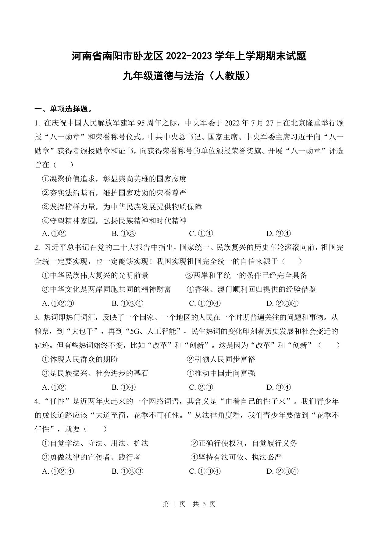 河南省南阳市卧龙区2022-2023学年上学期期末试题九年级道德与法治(人教版)