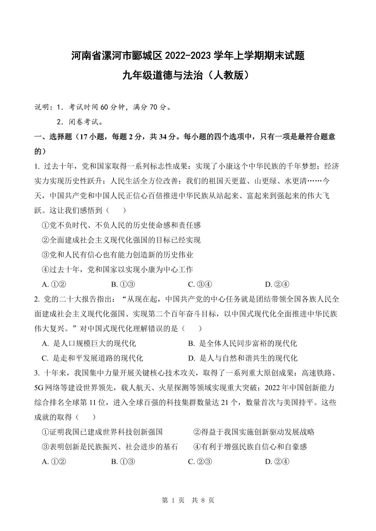 河南省漯河市郾城区2022-2023学年上学期期末试题九年级道德与法治(人教版)