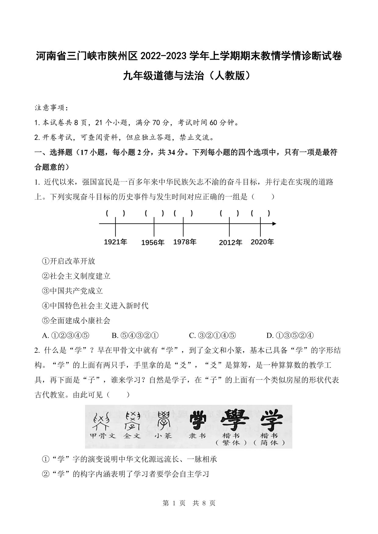 河南省三门峡市陕州区2022-2023学年上学期期末教情学情诊断试卷九年级道德与法治(人教版)