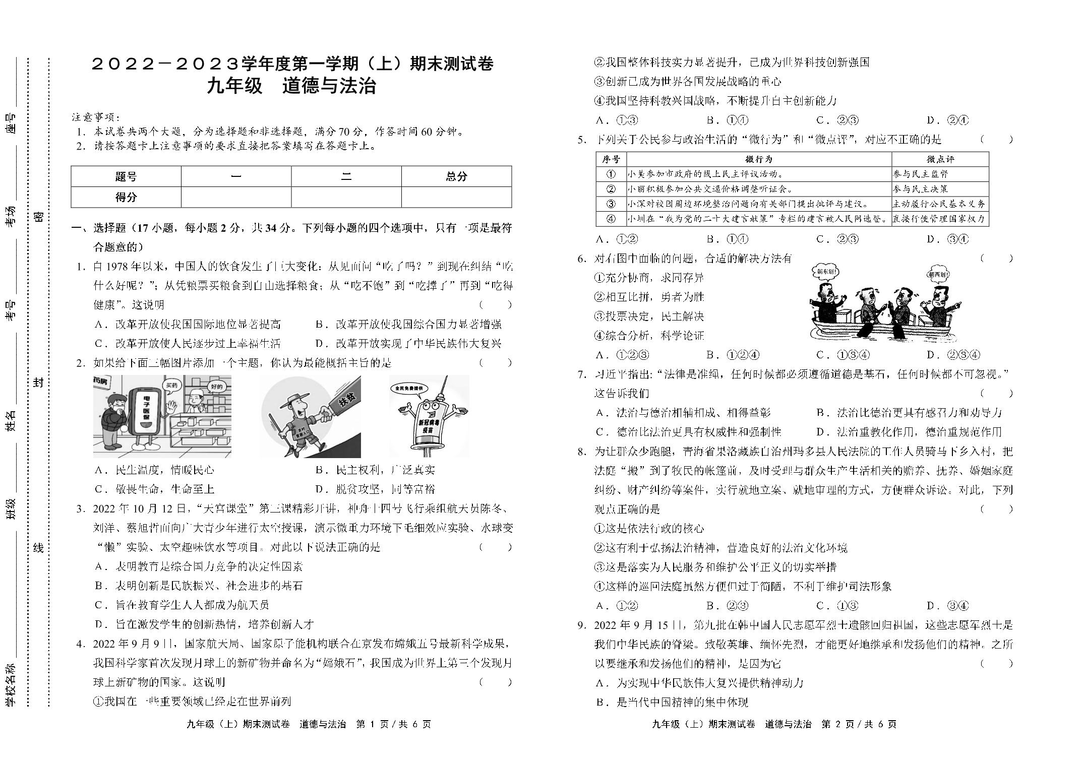 河南省商丘市永城市2022-2023学年度第一学期(上)期末测试卷九年级道德与法治(人教版)