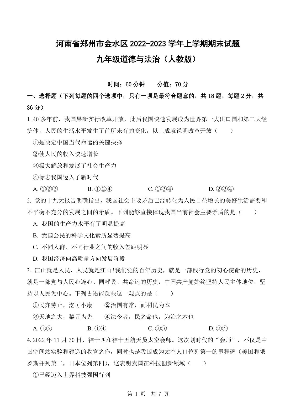 河南省郑州市金水区2022-2023学年上学期期末试题九年级道德与法治(人教版)