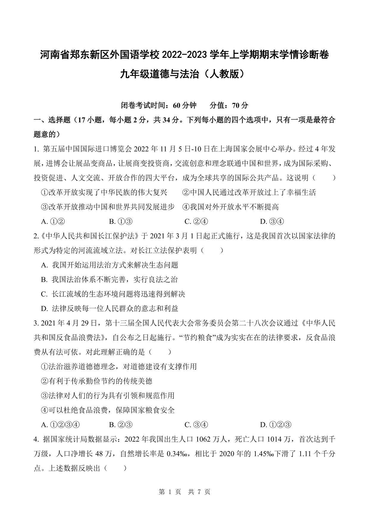 河南省郑州市郑东新区外国语学校2022-2023学年上学期期末学情诊断卷九年级道德与法治(人教版)