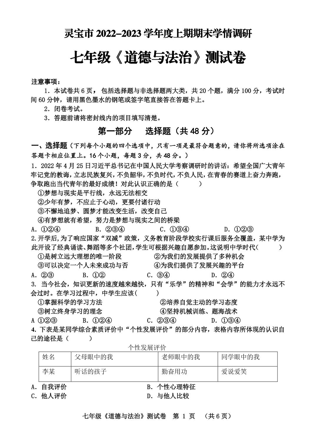 河南省三门峡市灵宝市2022-2023学年度上学期期末学情调研测试卷七年级道德与法治(人教版)
