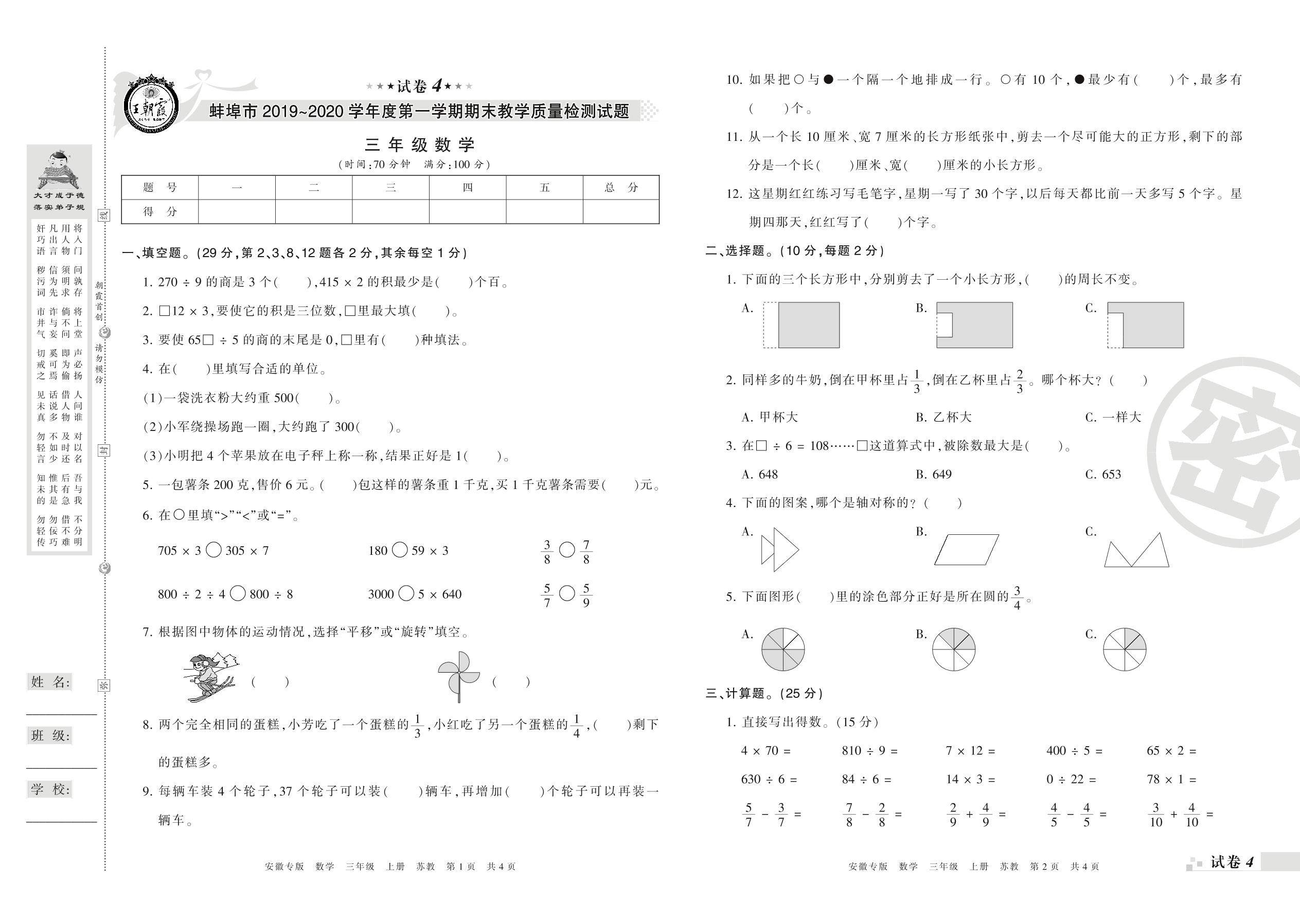 2019-2020学年第一学期蚌埠市三年级数学试卷(苏教版)【4】