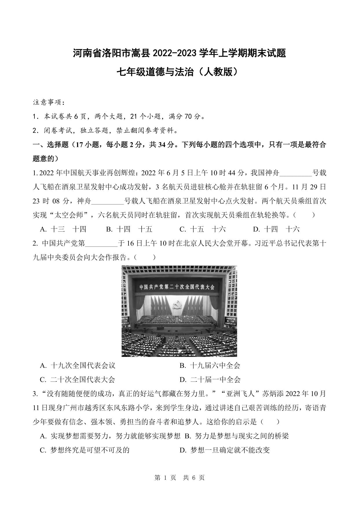 河南省洛阳市嵩县2022-2023学年上学期期末试题七年级道德与法治(人教版)