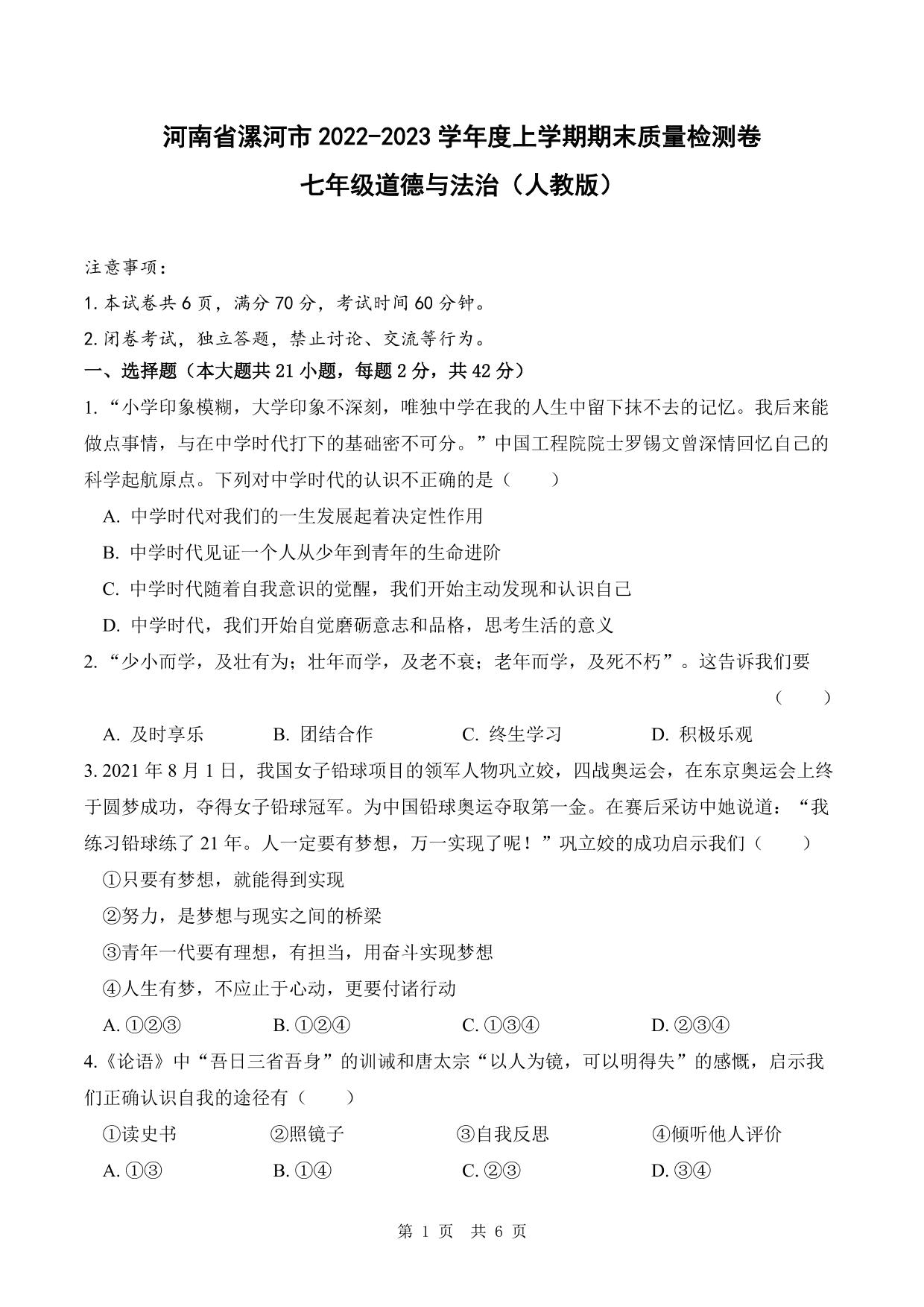 河南省漯河市2022-2023学年度上学期期末质量检测卷七年级道德与法治(人教版)