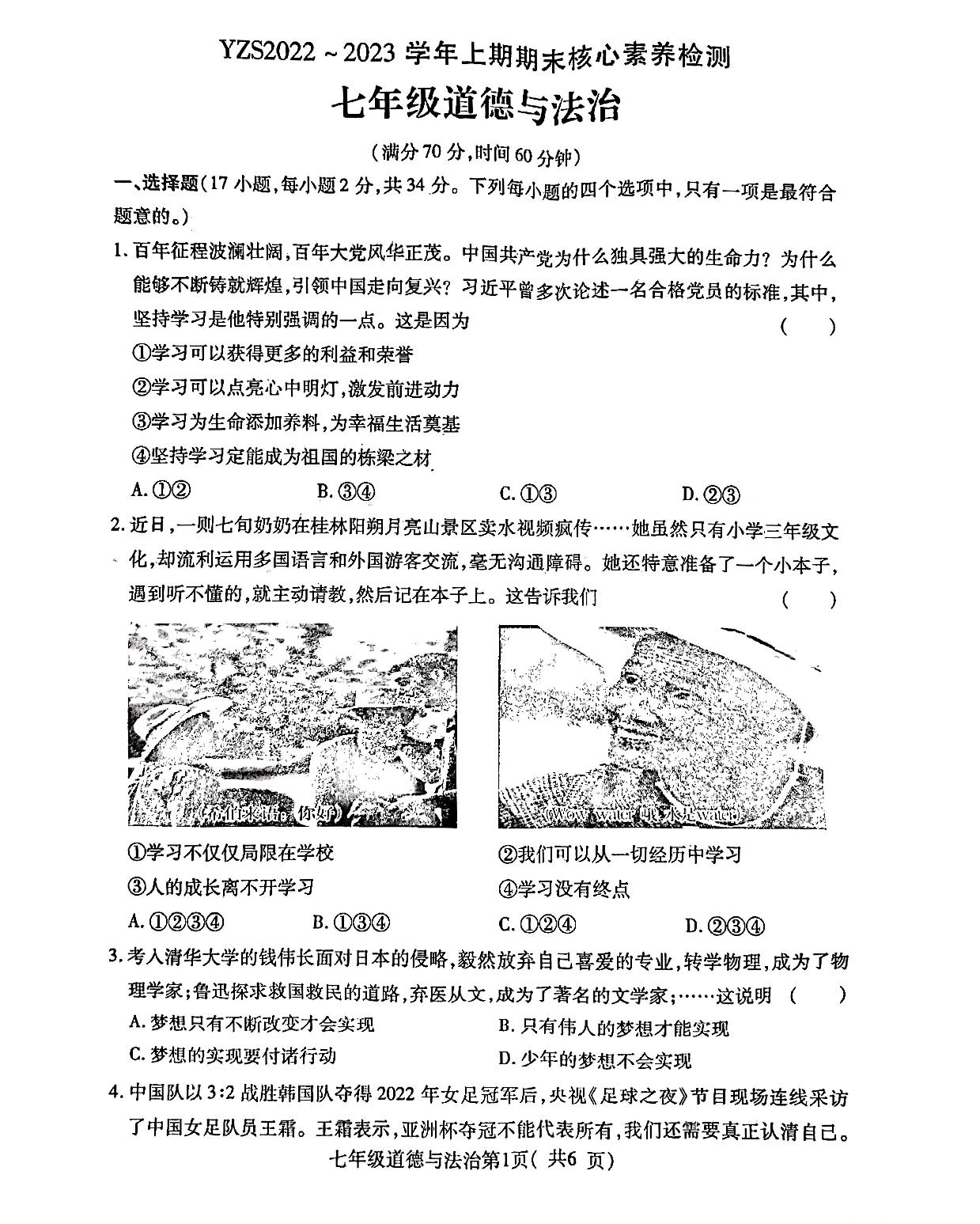 七年级道德与法治人教版上册期末卷