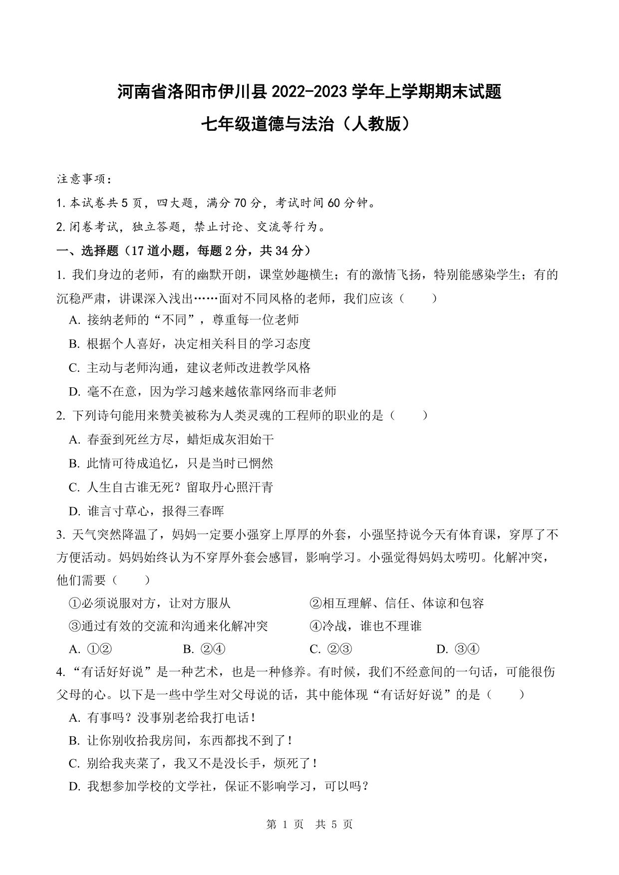 河南省洛阳市伊川县2022-2023学年上学期期末试题七年级道德与法治(人教版)
