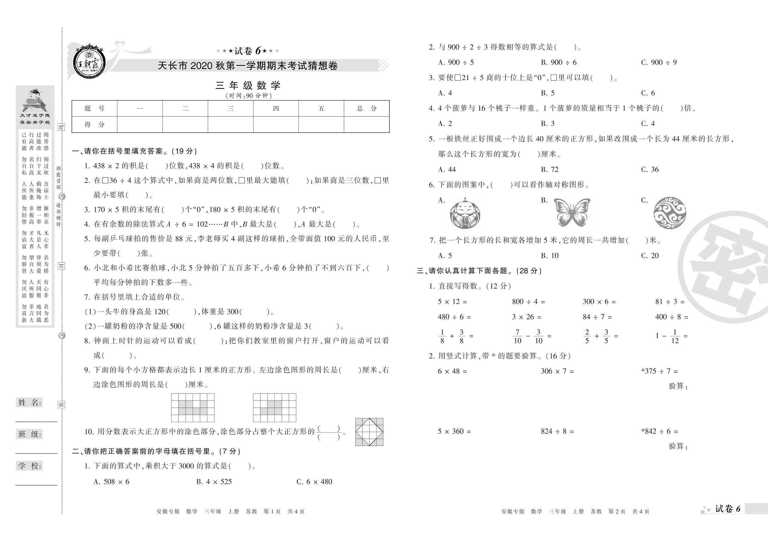 2019-2020学年第一学期天长市三年级数学试卷(苏教版)【6】