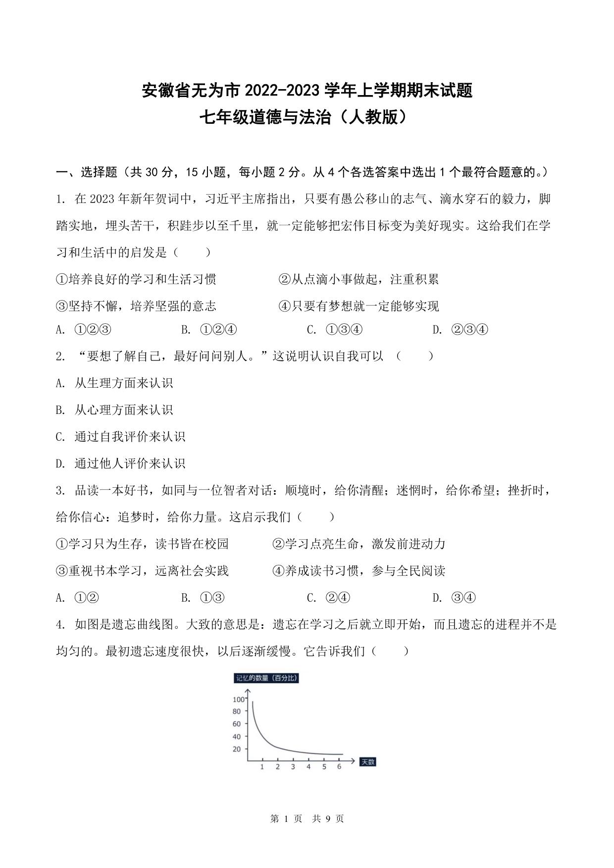 安徽省无为市2022-2023学年上学期期末试题七年级道德与法治(人教版)