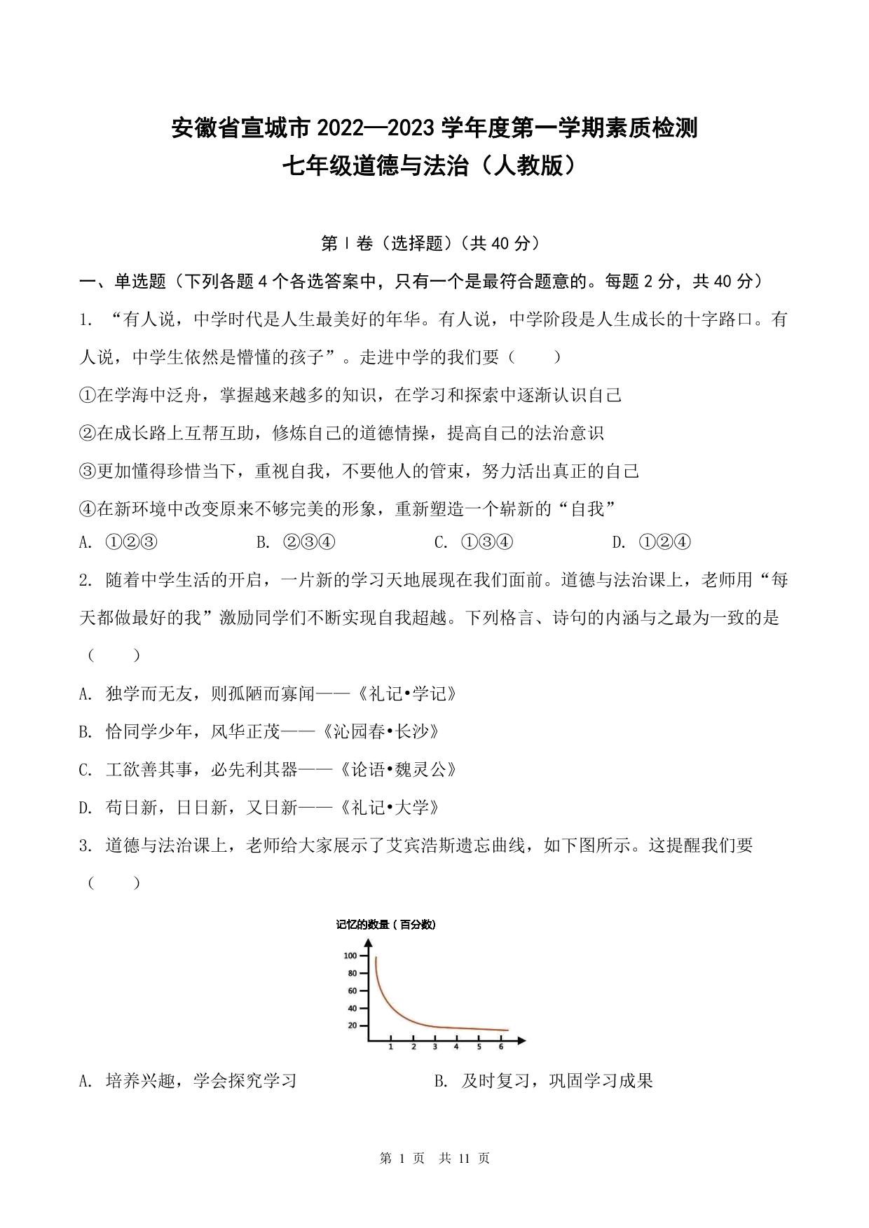 安徽省宣城市2022-2023学年度第一学期素质检测七年级道德与法治(人教版)