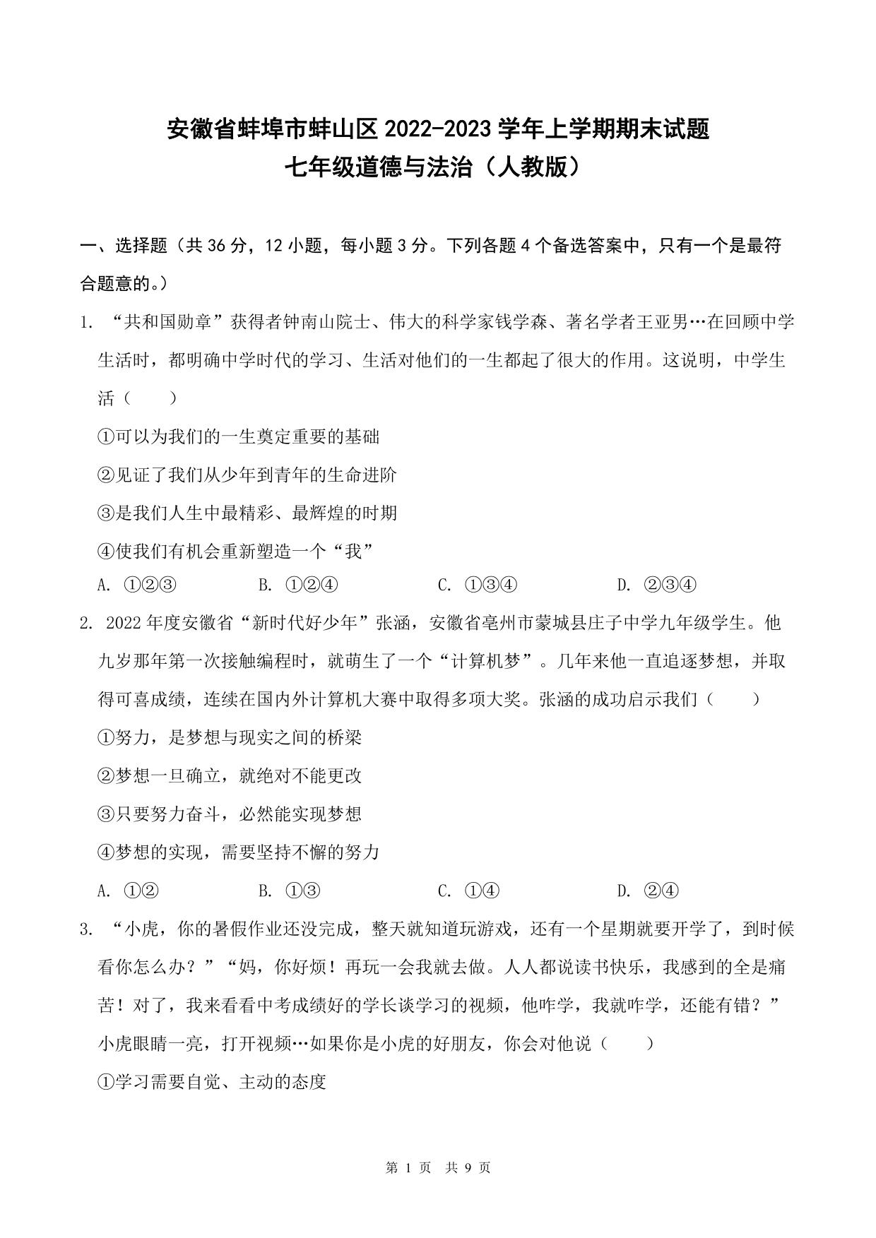 安徽省蚌埠市蚌山区2022-2023学年上学期期末试题七年级道德与法治(人教版)