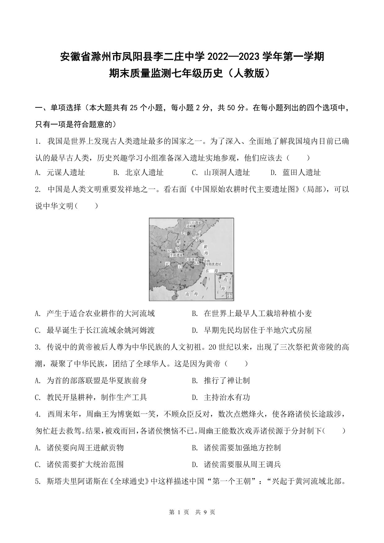 安徽省滁州市凤阳县李二庄中学2022-2023学年第一学期期末质量监测七年级历史(人教版)