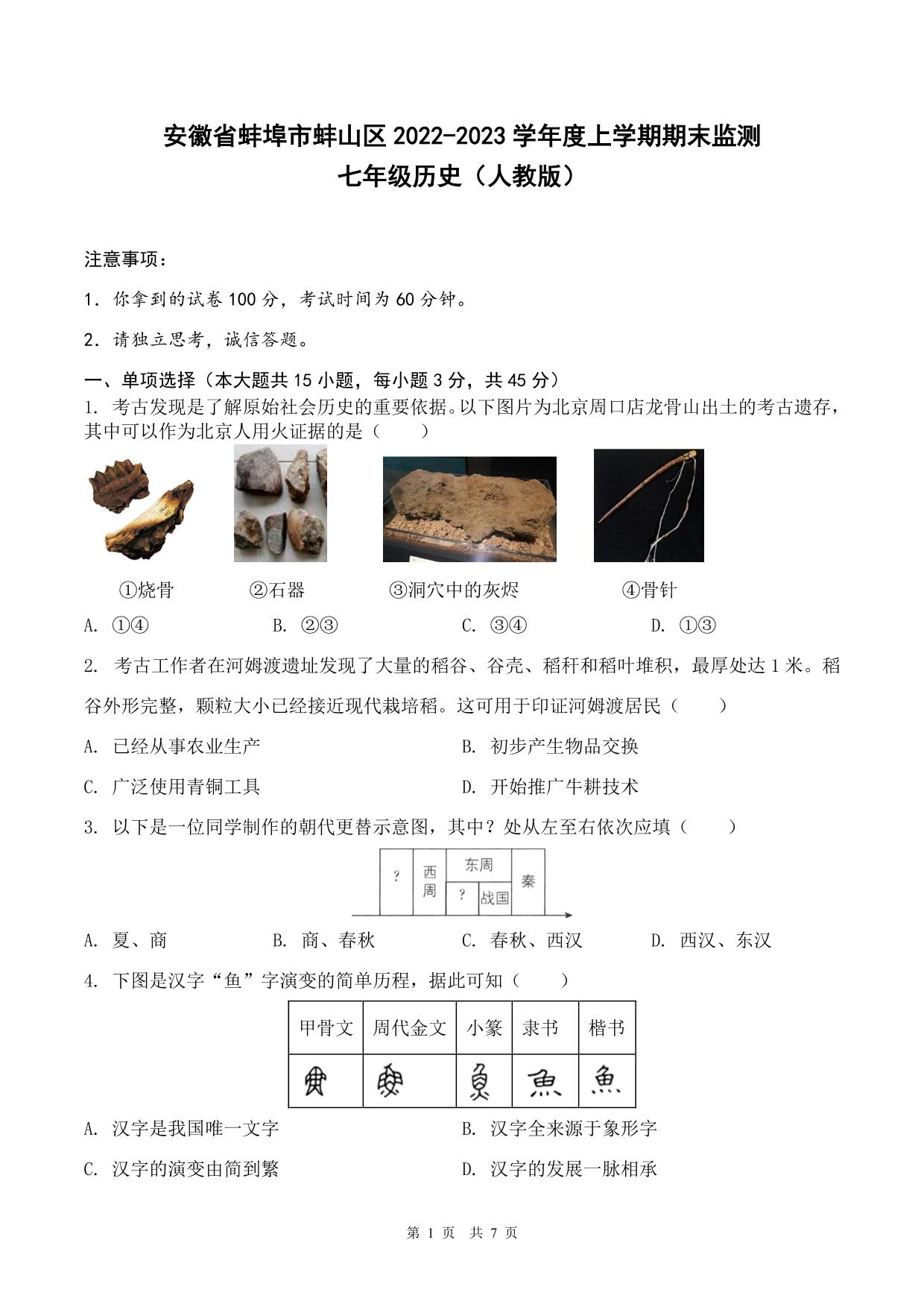安徽省蚌埠市蚌山区2022-2023学年度上学期期末监测七年级历史(人教版)