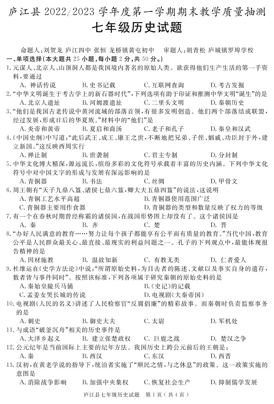 安徽省合肥市庐江县2022-2023度第一学期期末教学质量抽测七年级历史(人教版)