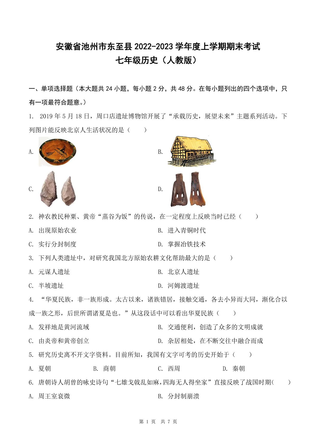 安徽省池州市东至县2022-2023学年度上学期期末考试七年级历史(人教版)