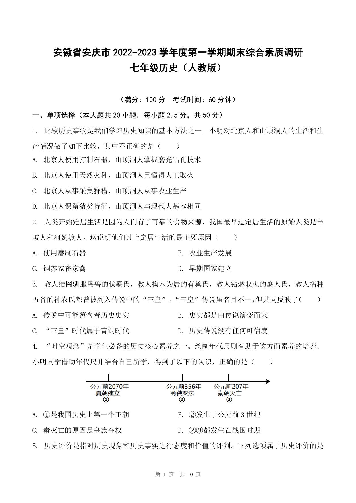 安徽省安庆市2022-2023学年度第一学期期末综合素质调研七年级历史(人教版)