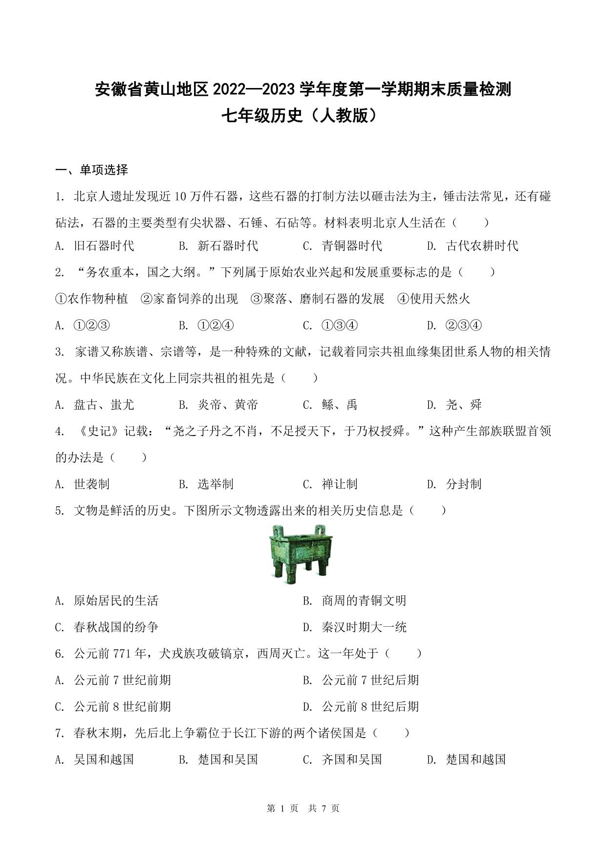 安徽省黄山地区2022-2023学年度第一学期期末质量检测七年级历史(人教版)