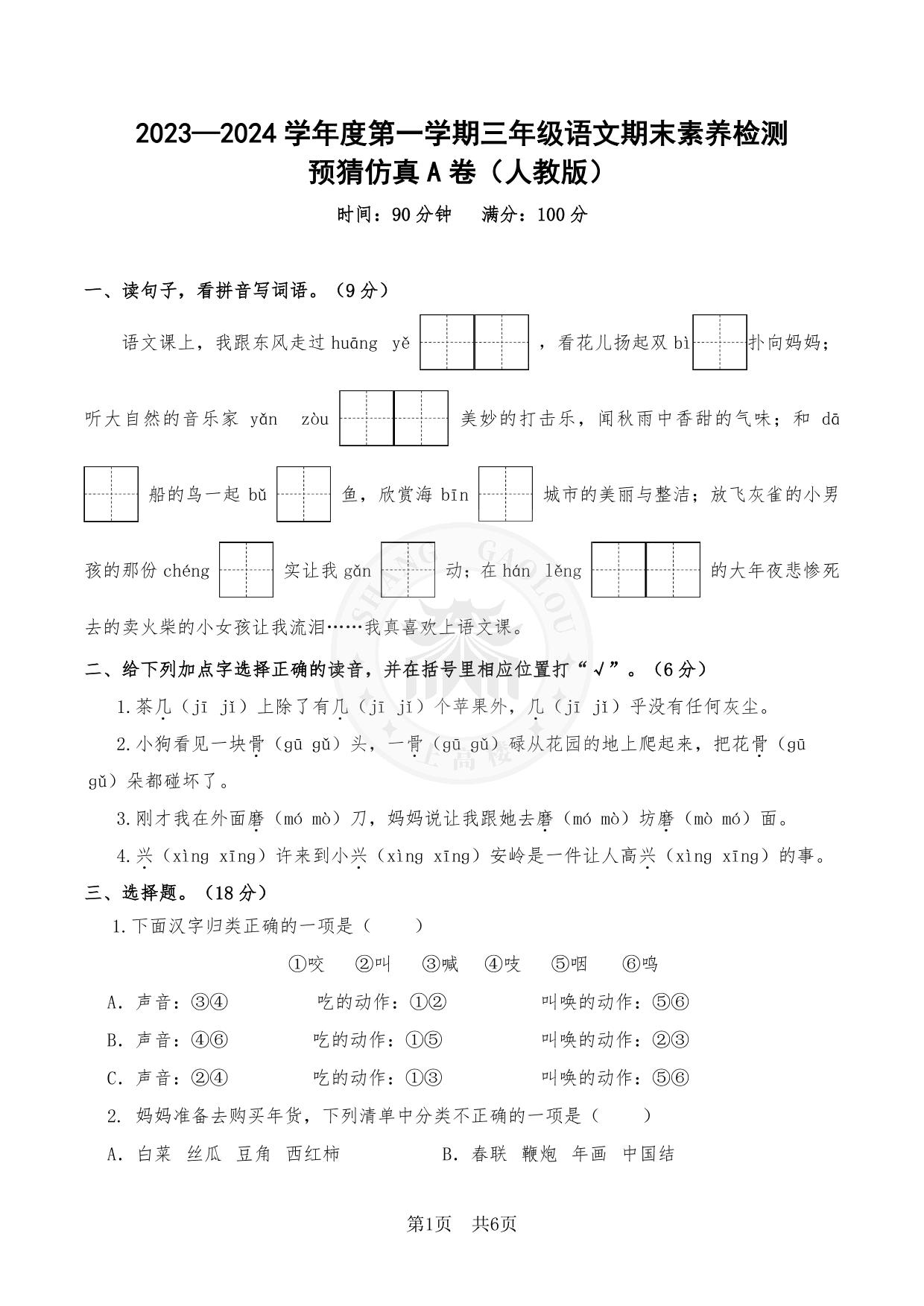 2023—2024学年度第一学期三年级语文期末素养检测预猜仿真A卷(人教版)