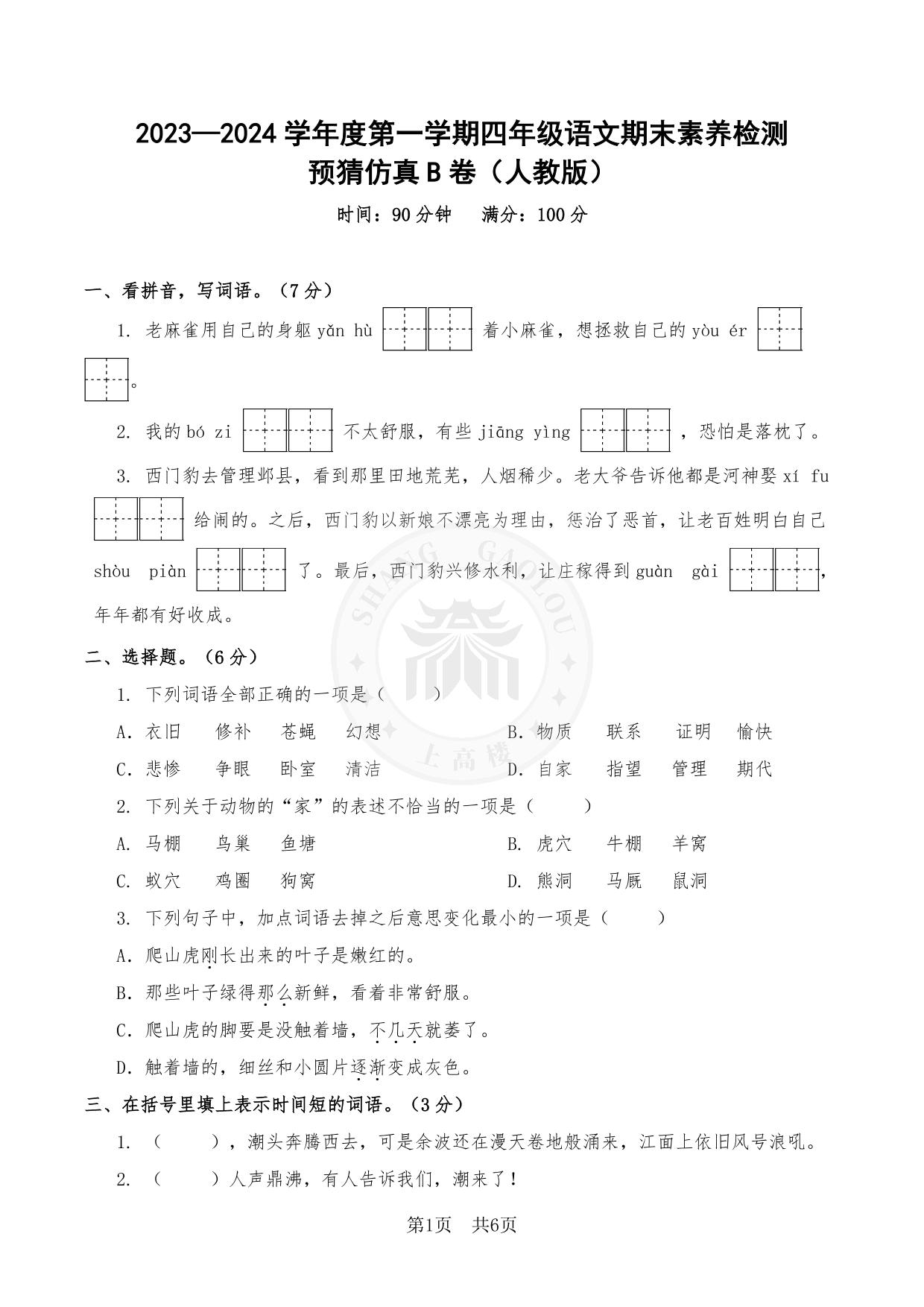 2023—2024学年度第一学期四年级语文期末素养检测预猜仿真B卷(人教版)