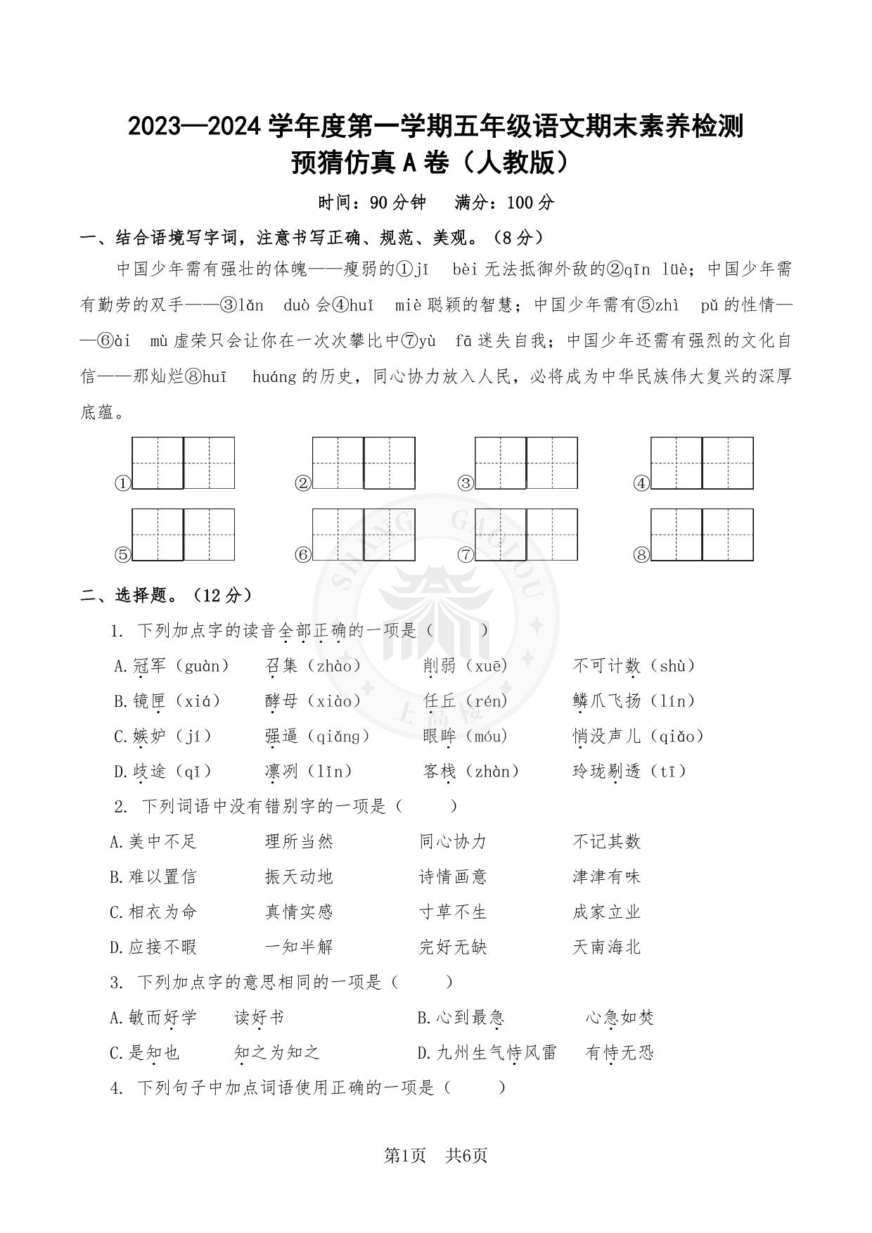 2023—2024学年度第一学期五年级语文期末素养检测预猜仿真A卷(人教版)