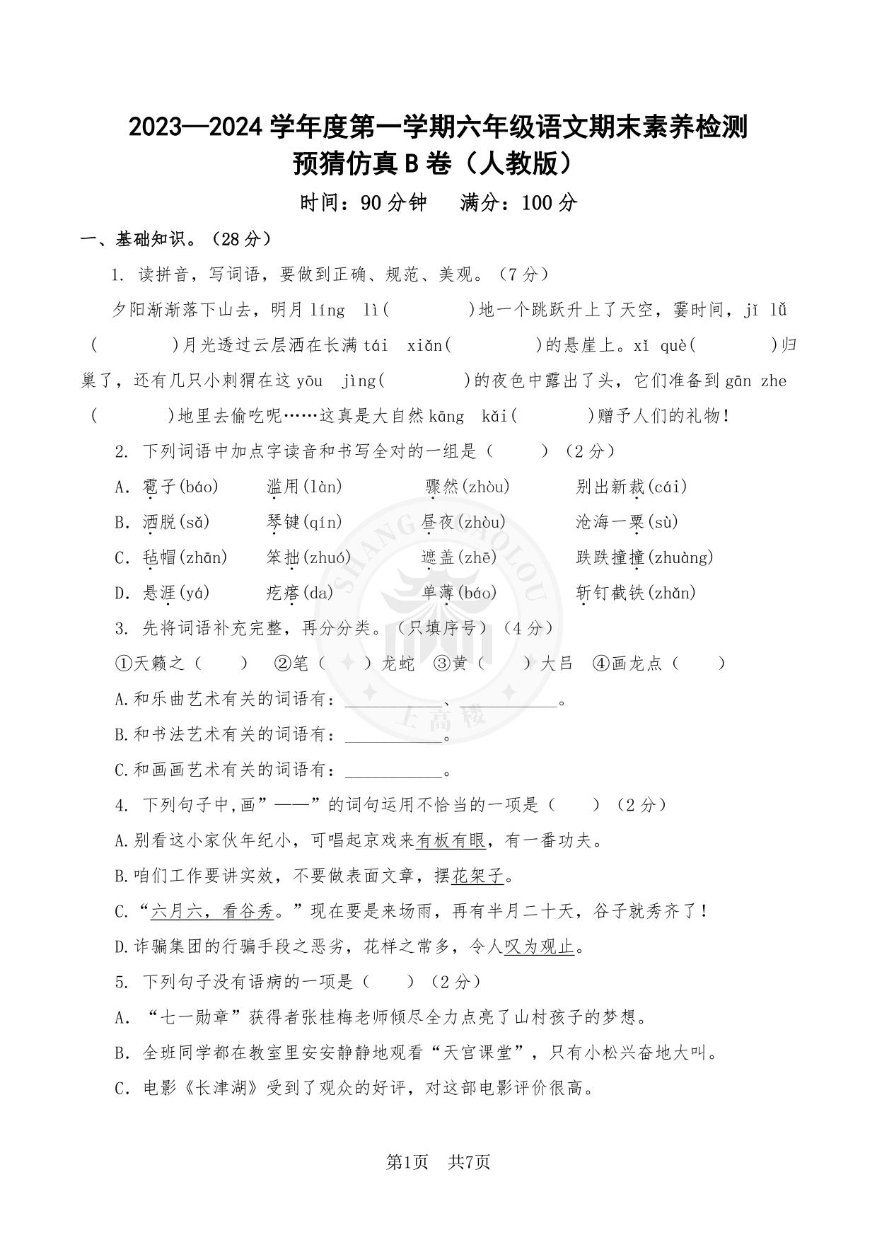 2023—2024学年度第一学期六年级语文期末素养检测预猜仿真B卷(人教版)