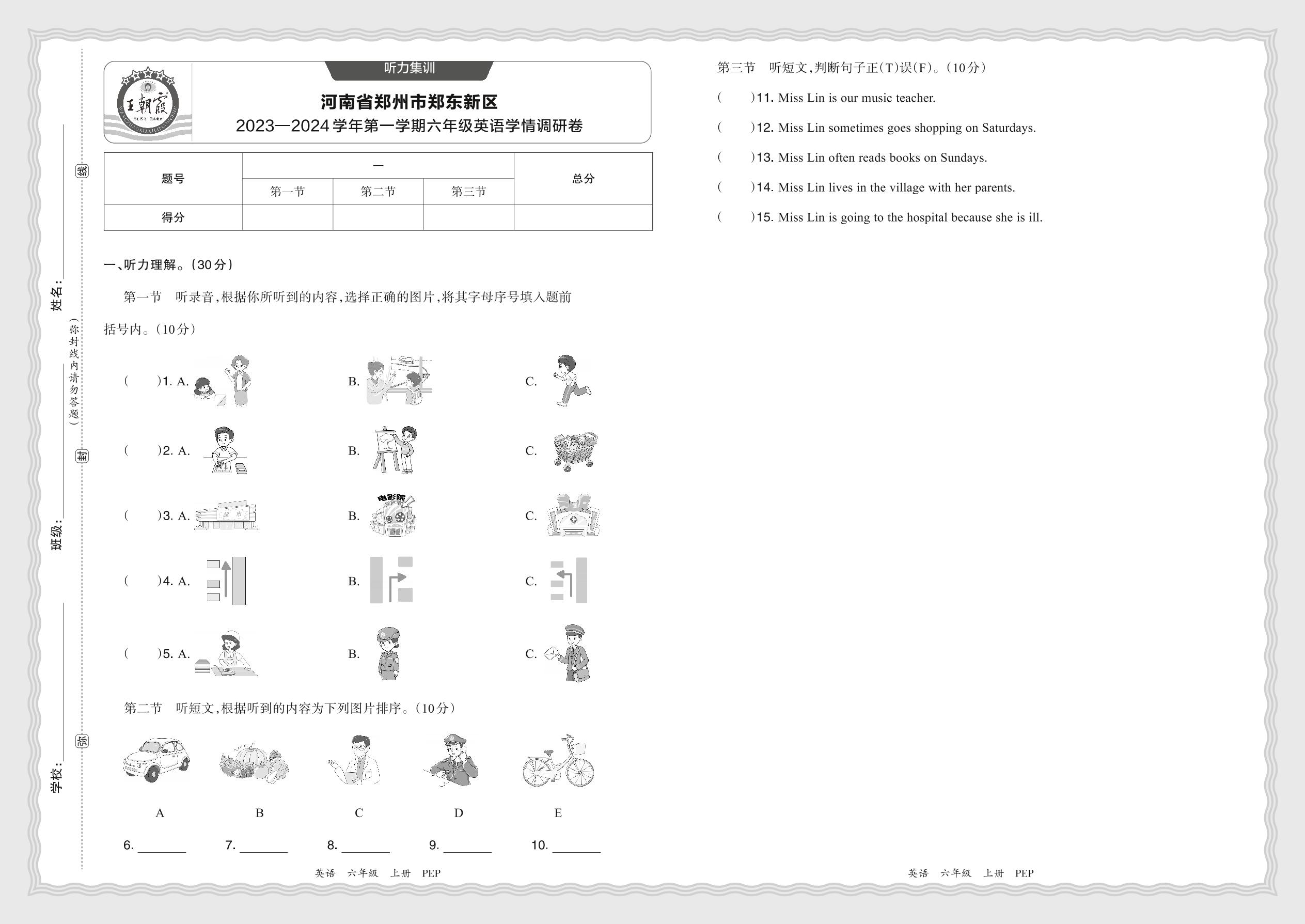 【听力集训】河南省郑州市郑东新区2023—2024学年第一学期六年级英语学情调研卷(人教PEP版)