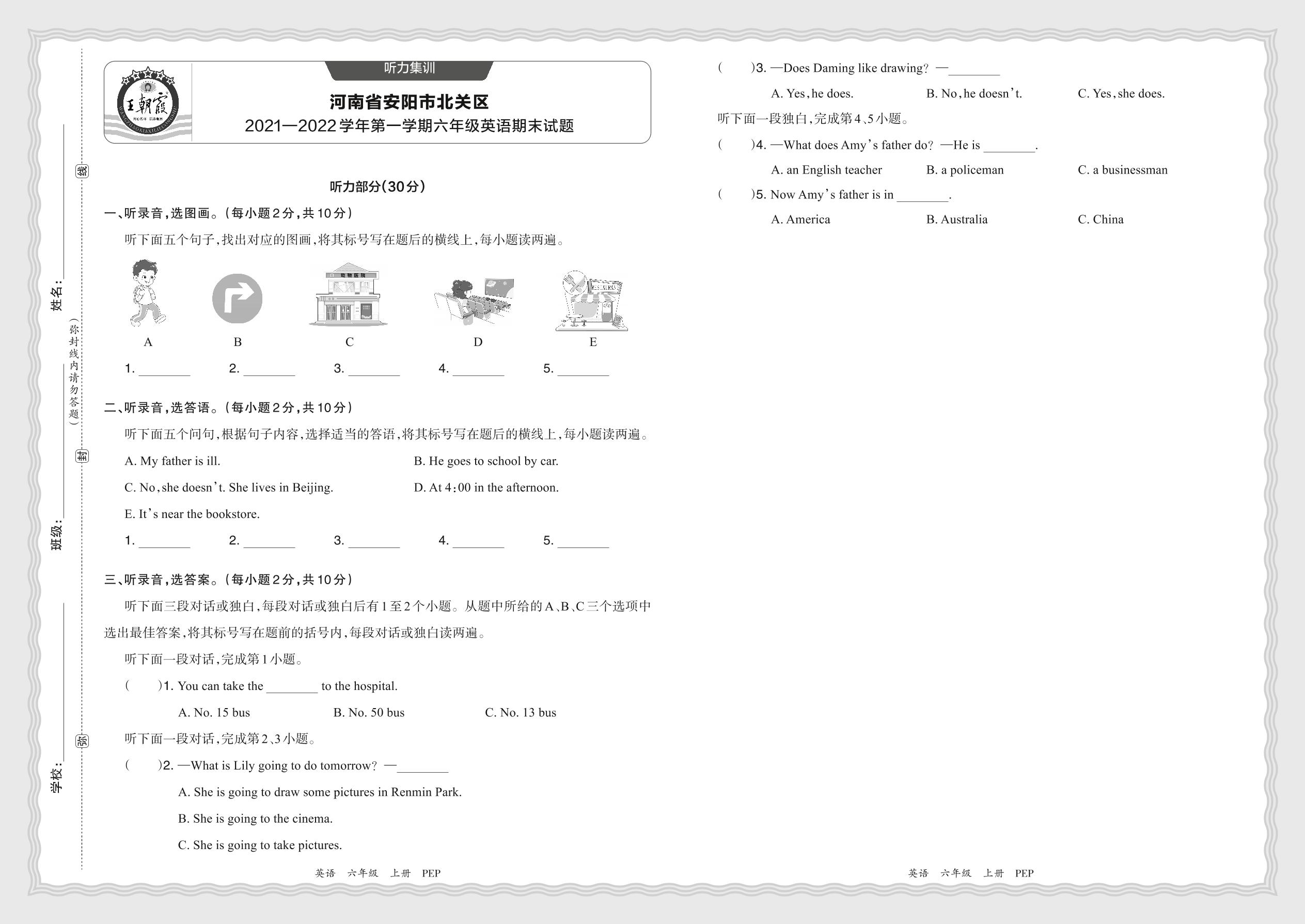 【听力集训】河南省安阳市北关区2021—2022学年第一学期六年级英语期末试题(人教PEP版)