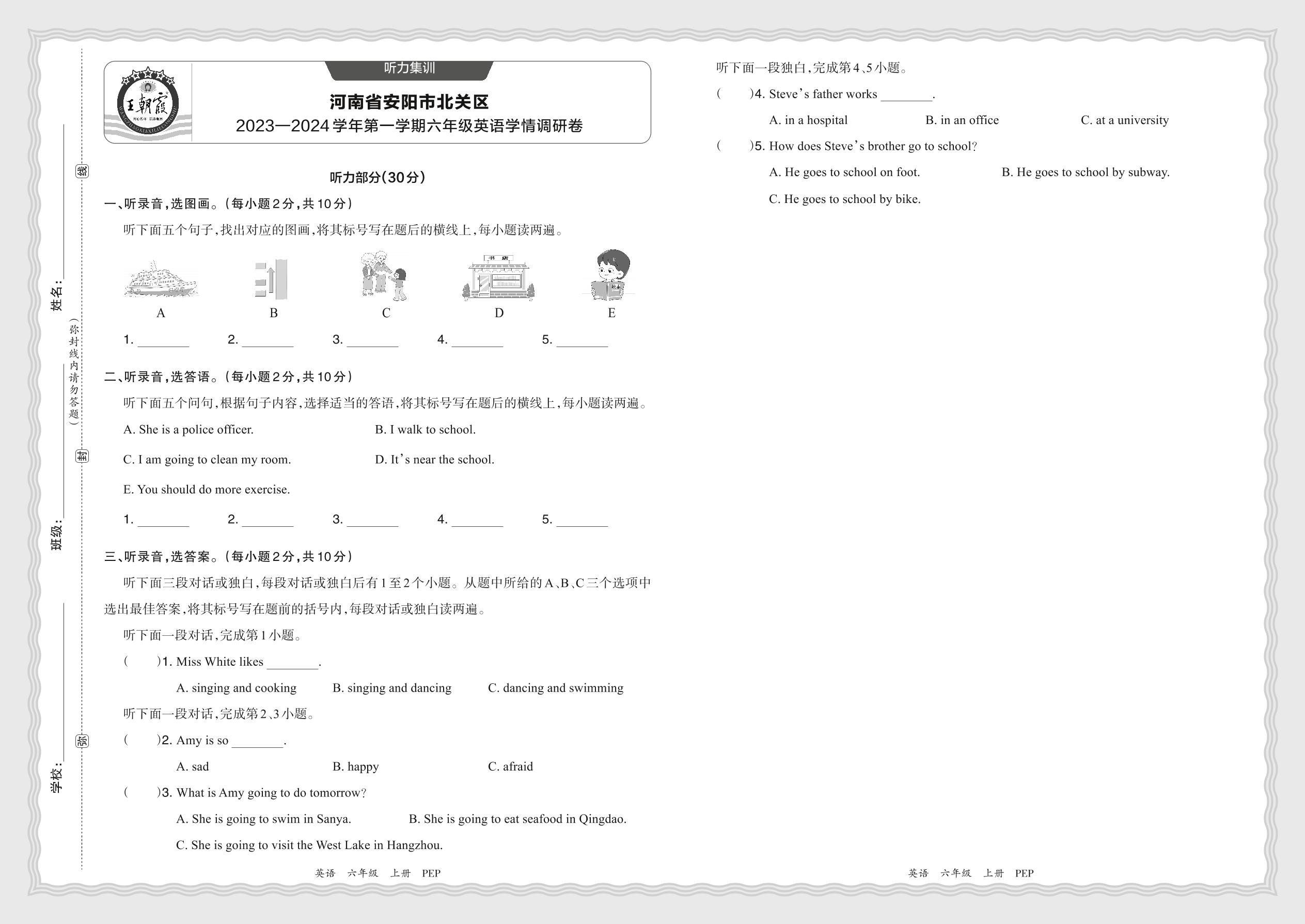 【听力集训】河南省安阳市北关区2023—2024学年第一学期六年级英语学情调研卷(人教PEP版)