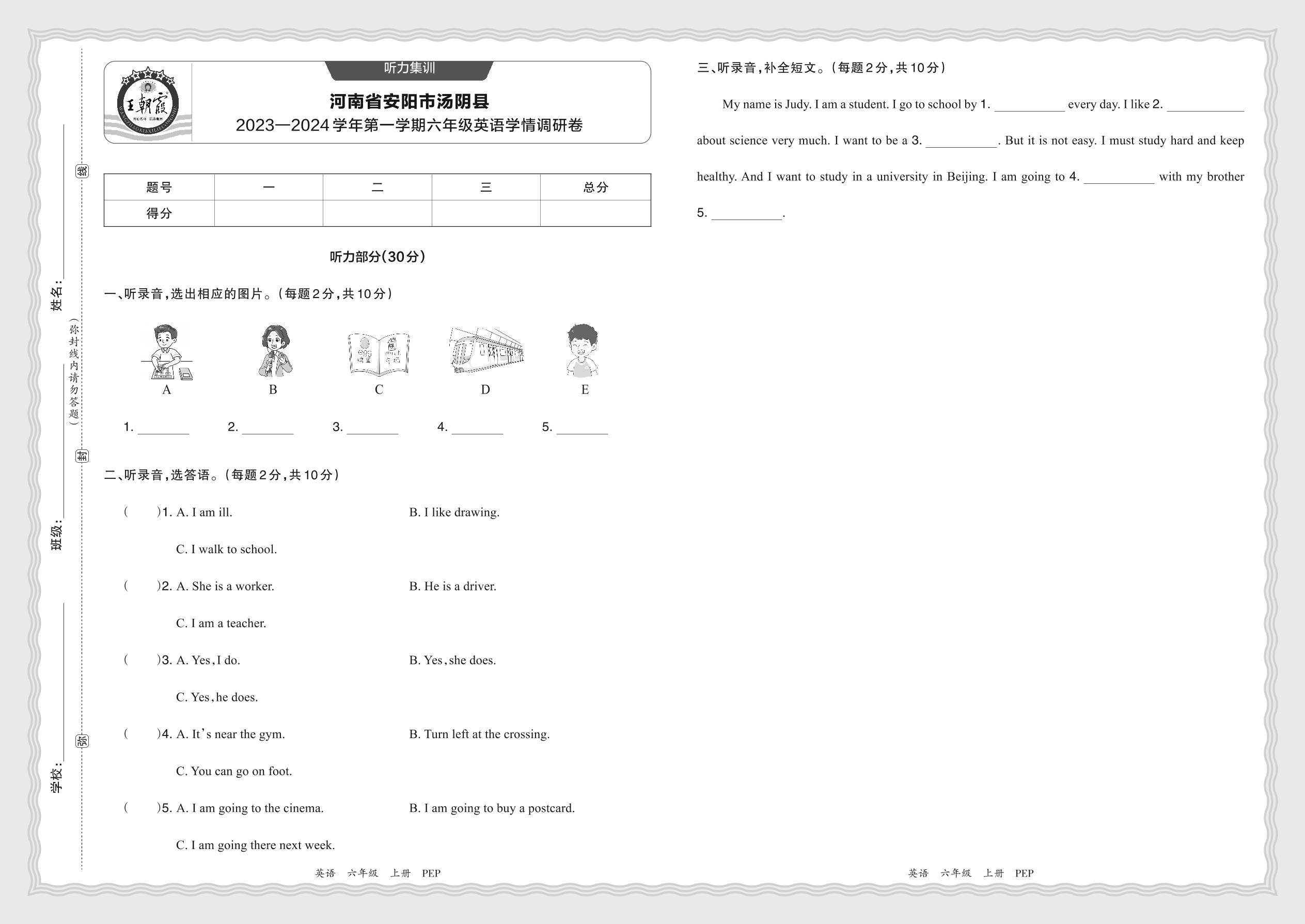 【听力集训】河南省安阳市汤阴县2023—2024学年第一学期六年级英语学情调研卷(人教PEP版)