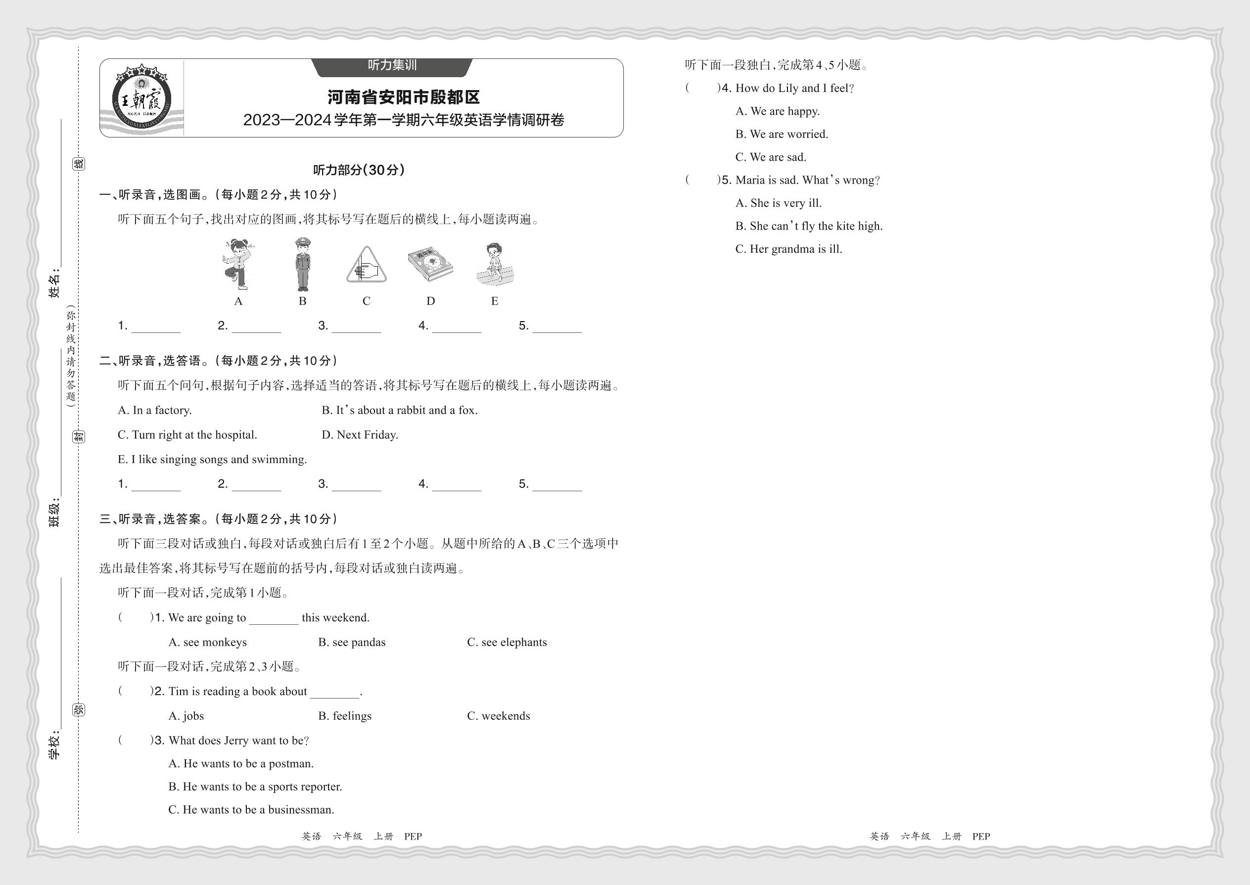【听力集训】河南省安阳市殷都区2023—2024学年第一学期六年级英语学情调研卷(人教PEP版)