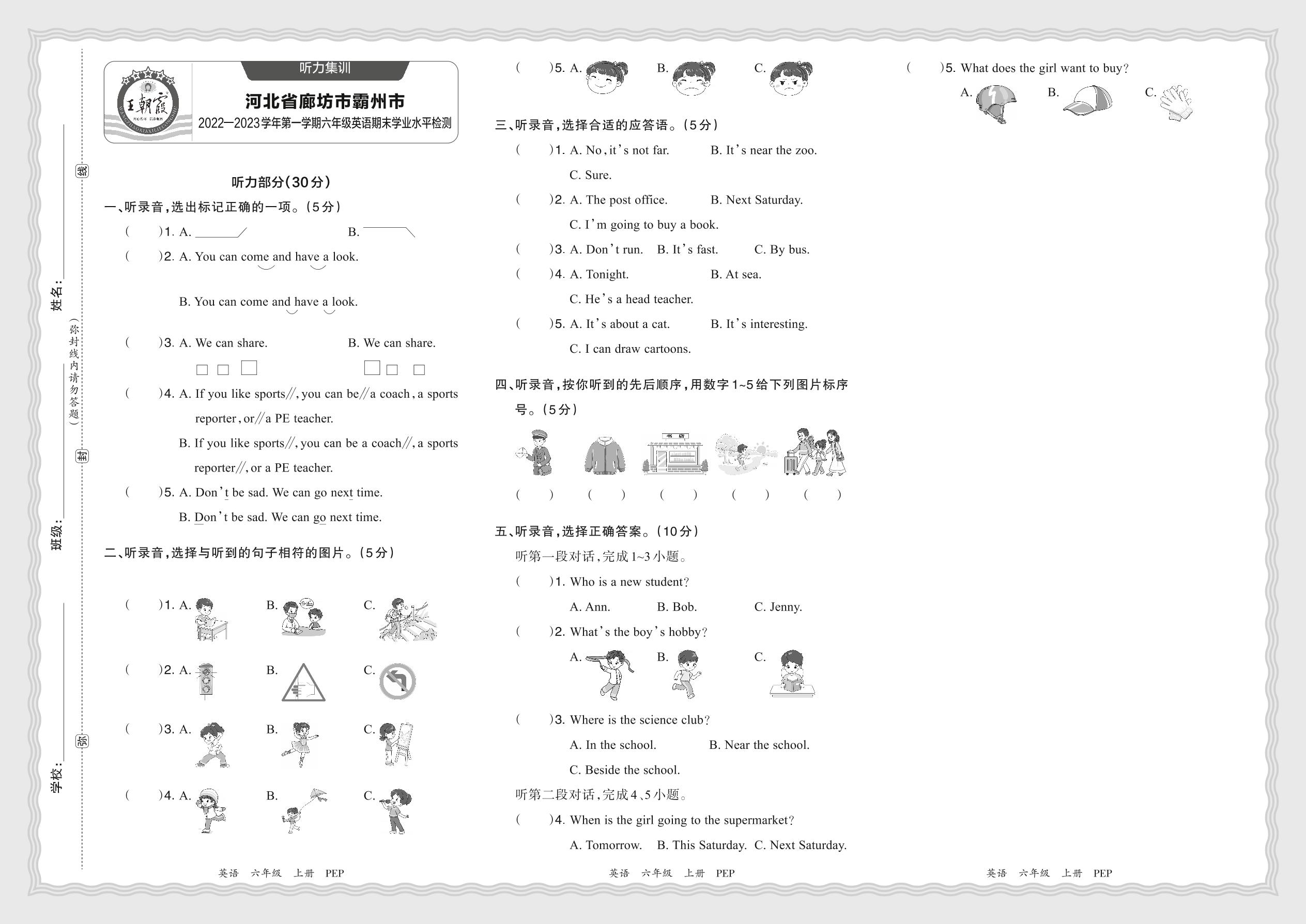 【听力集训】河北省廊坊市霸州市2022—2023学年第一学期六年级英语期末学业水平检测(人教PEP版)