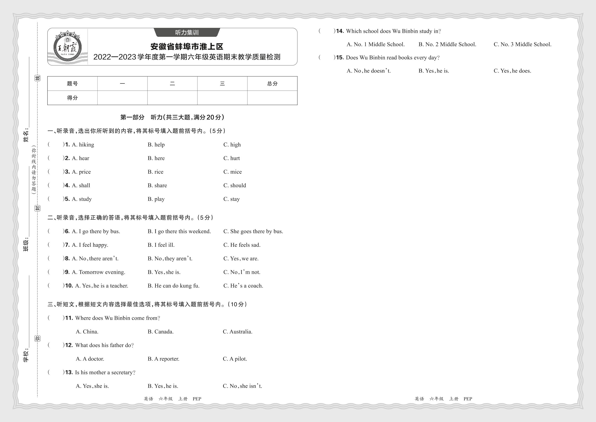 【听力集训】安徽省蚌埠市淮上区2022—2023学年度第一学期六年级英语期末教学质量检测(人教PEP版)