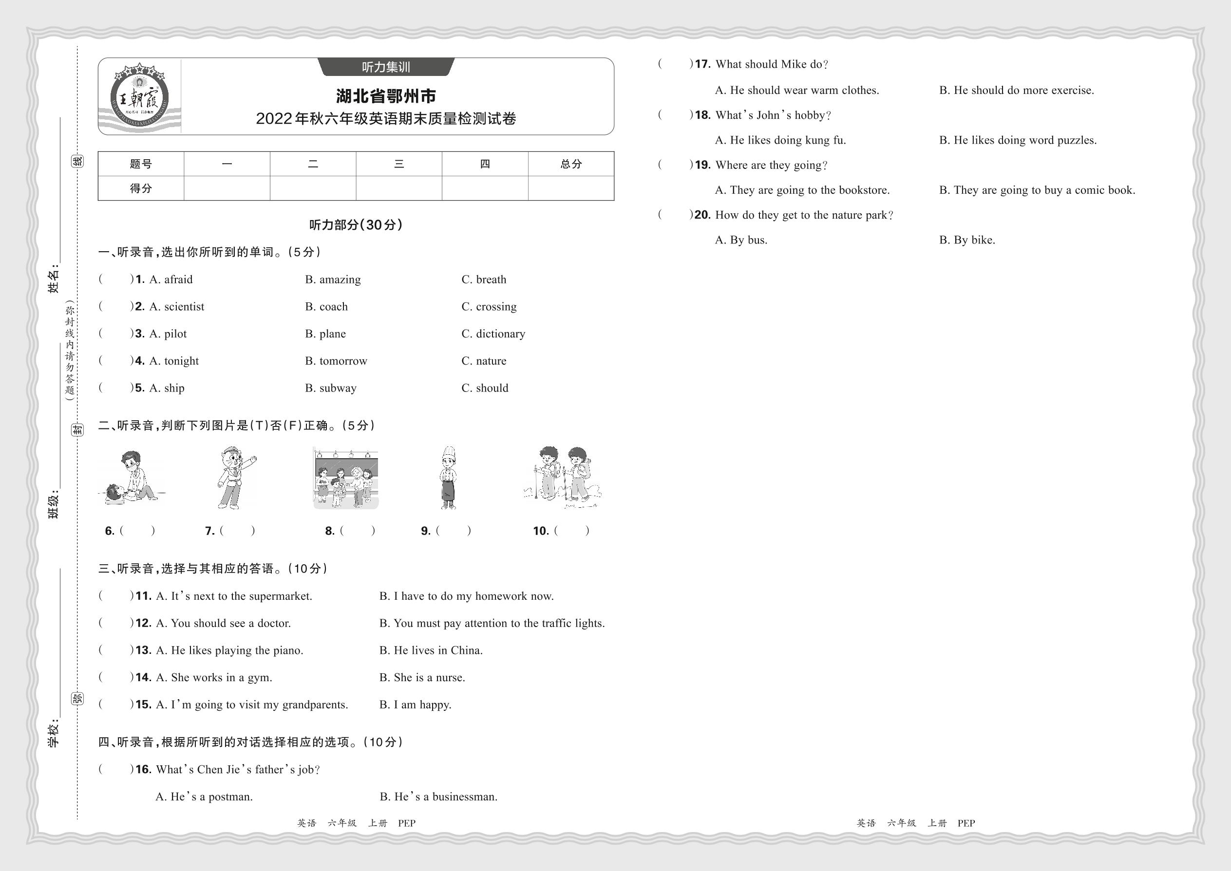 【听力集训】湖北省鄂州市2022年秋六年级英语期末质量检测试卷(人教PEP版)