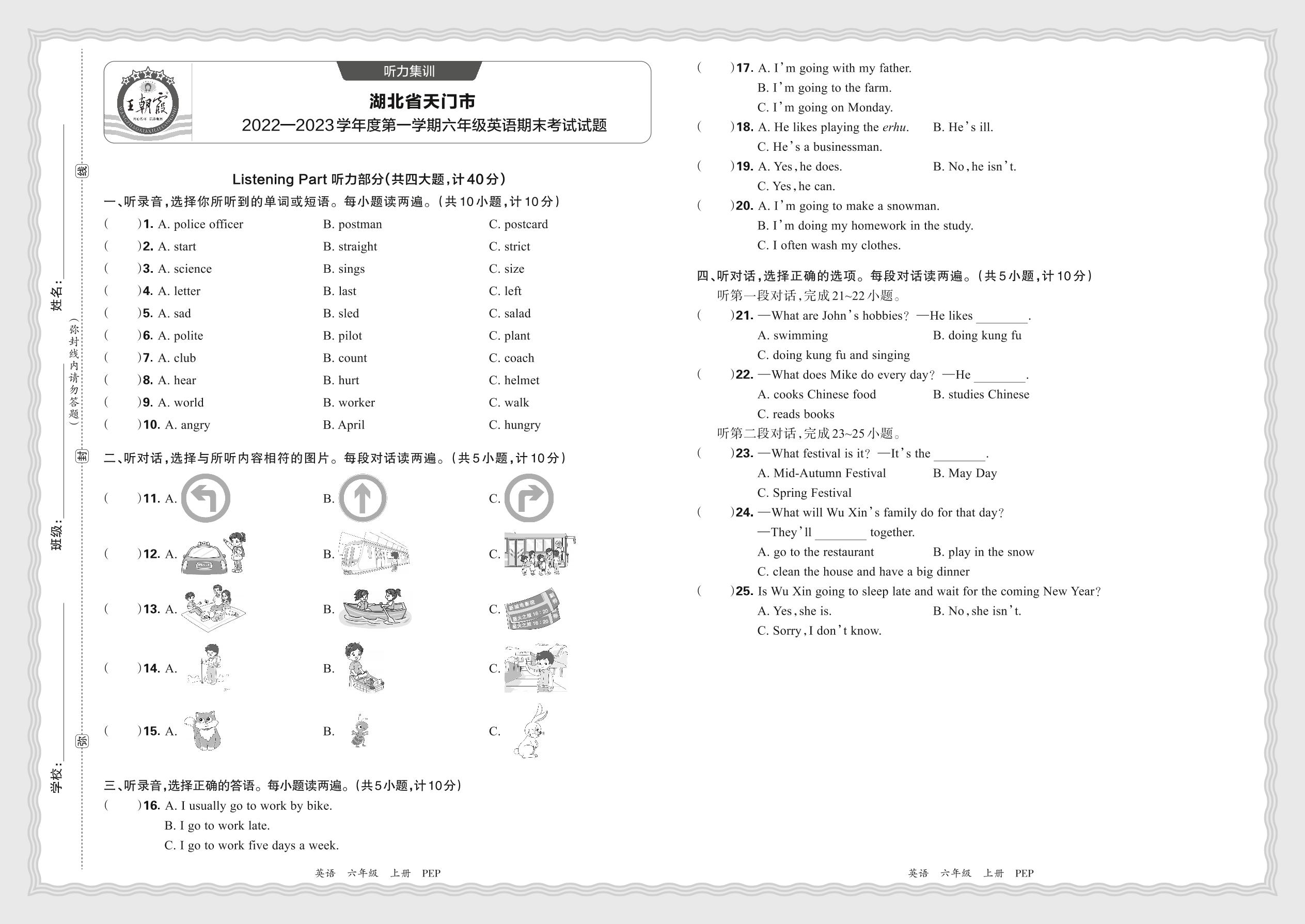 【听力集训】湖北省天门市2022—2023学年度第一学期六年级英语期末考试试题(人教PEP版)