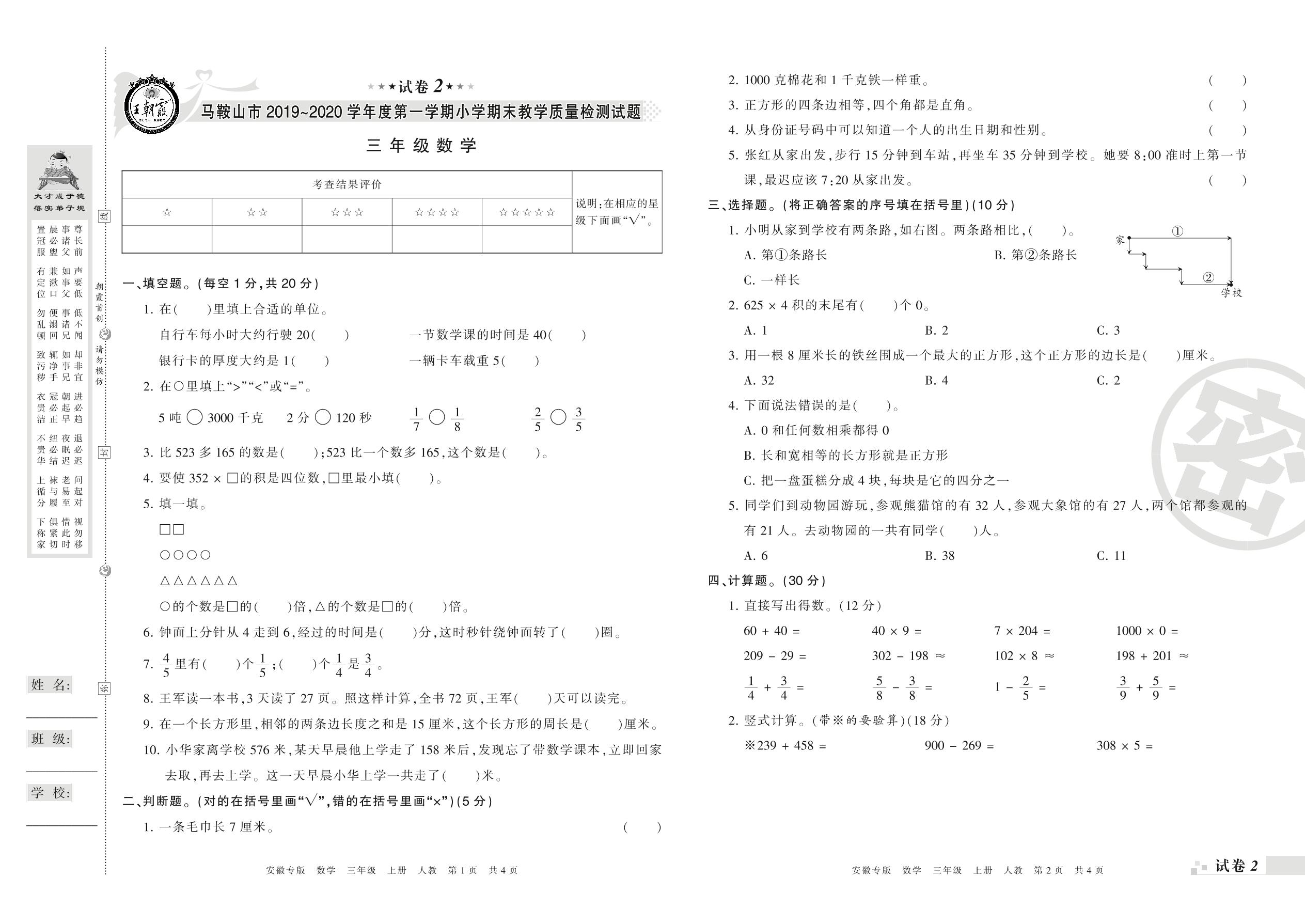 2019-2020学年第一学期马鞍山市三年级数学试卷(人教版)【2】