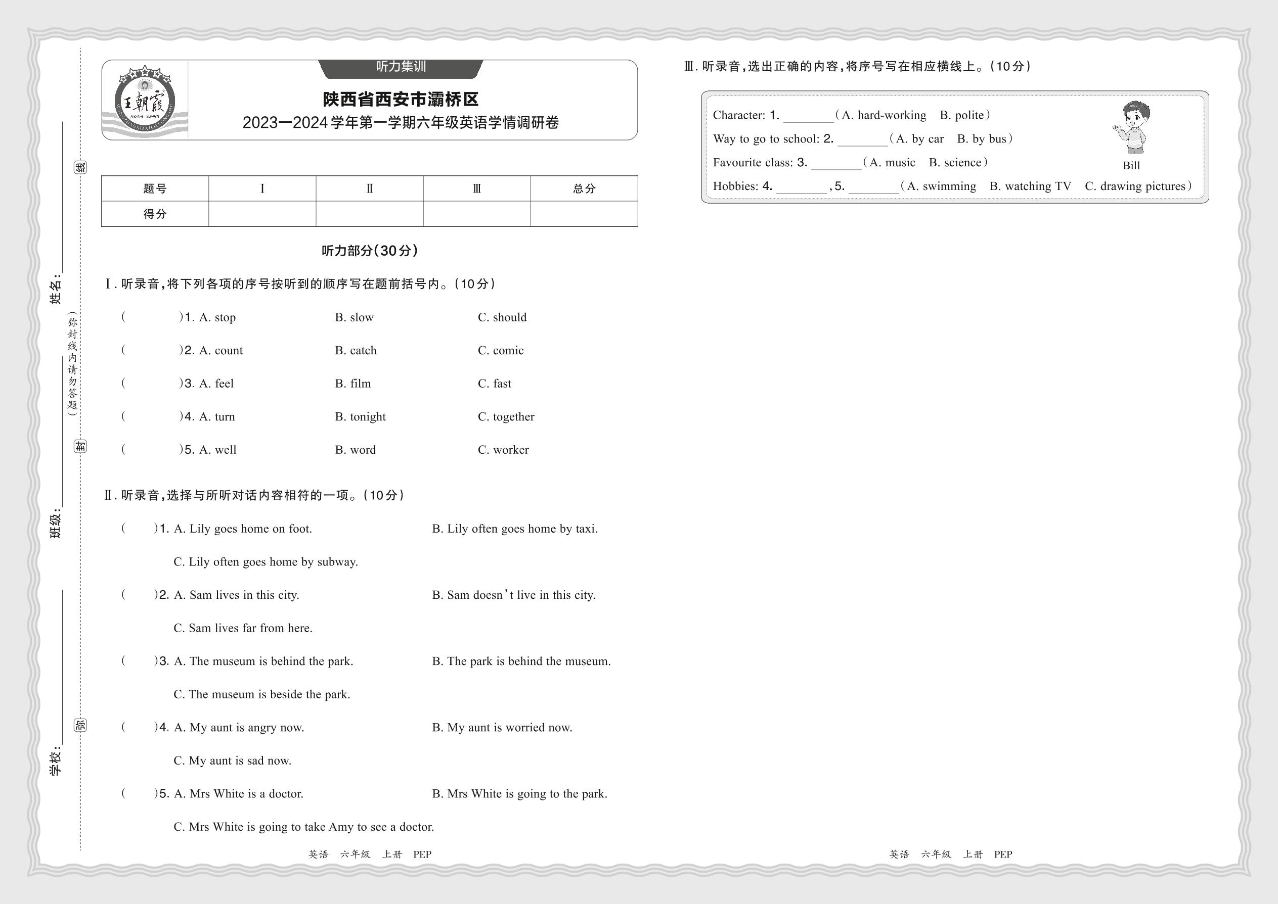 【听力集训】陕西省西安市灞桥区2023—2024学年第一学期六年级英语学情调研卷(人教PEP版)