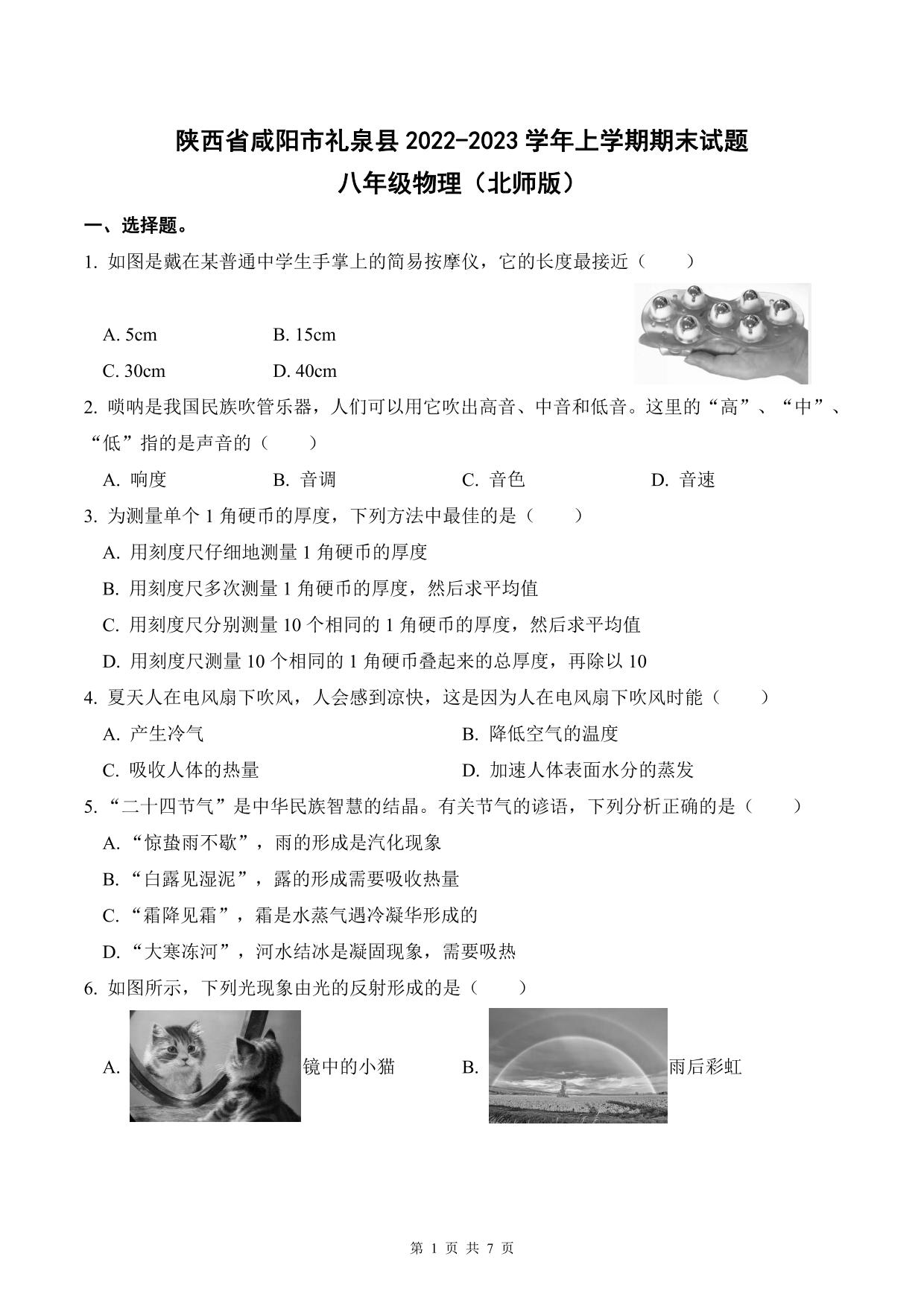 陕西省咸阳市礼泉县2022—2023学年上学期期末试题八年级物理(北师版)
