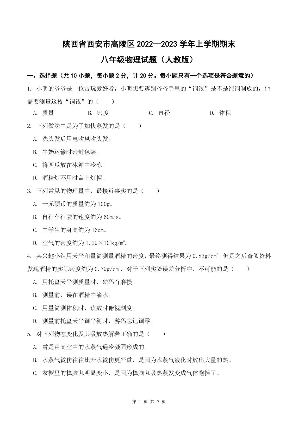陕西省西安市高陵区2022—2023学年上学期期末八年级物理试题(人教版)