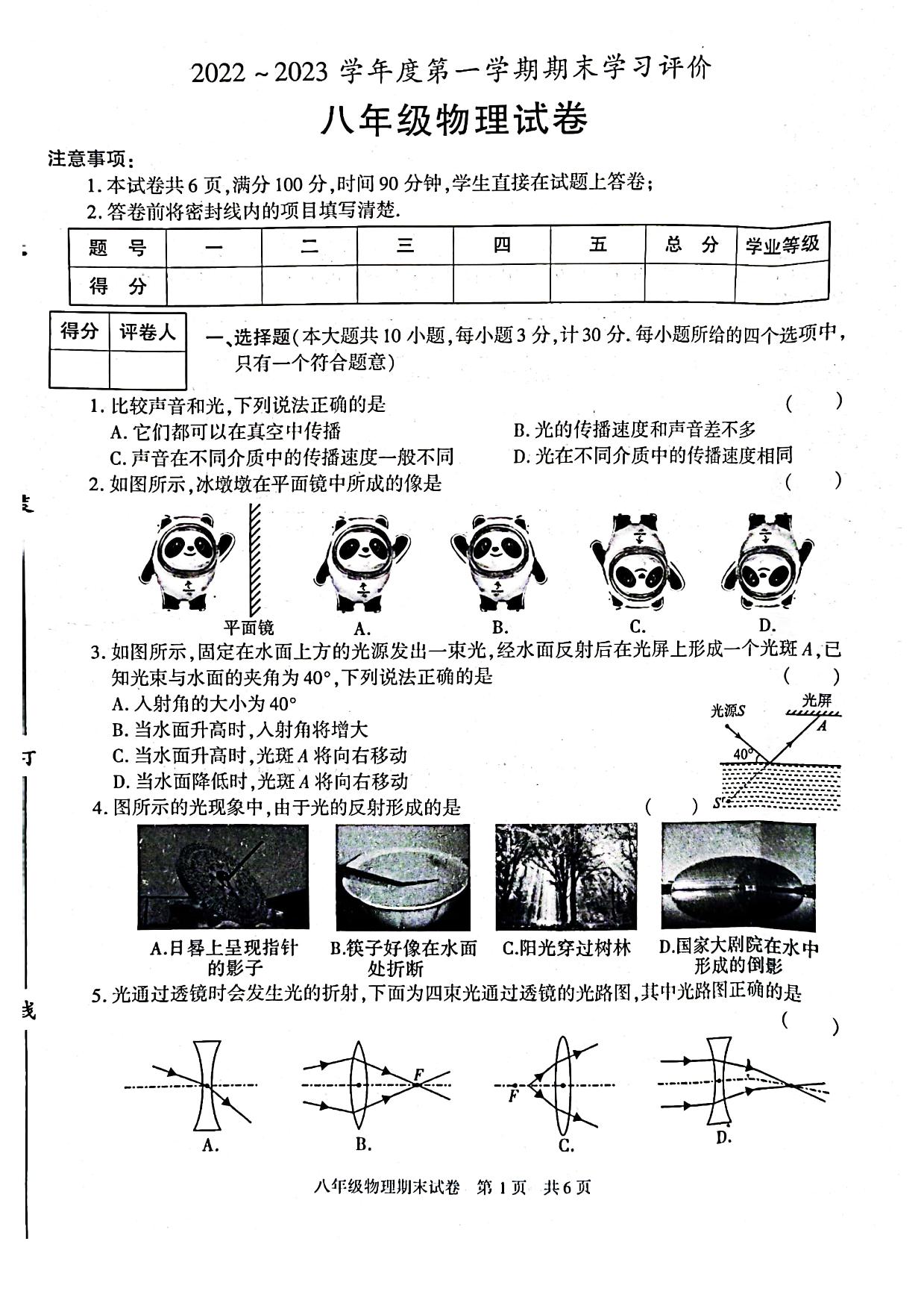陕西省西安市长安区2022—2023学年上学期期末试卷八年级物理(苏科版)