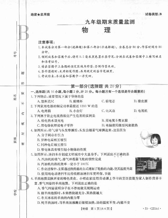 陕西省延安市富县2022—2023学年上学期期末质量监测九年级物理(人教版)