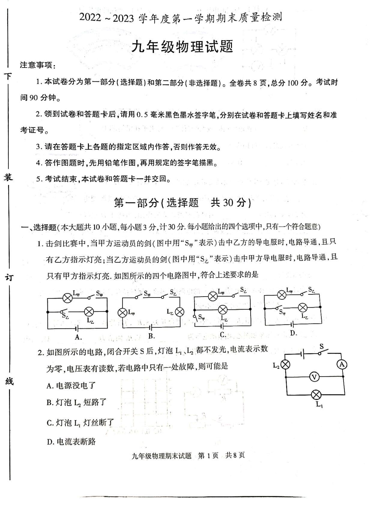 陕西省西安市长安区2022—2023学年上学期期末物理试卷九年级(苏科版)