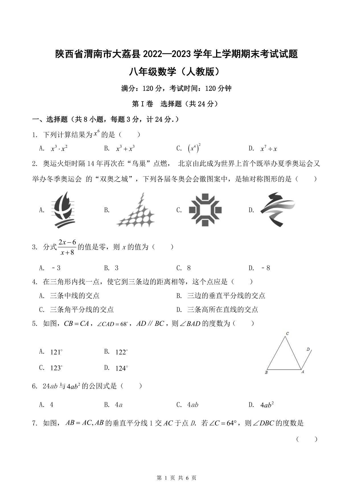 陕西省渭南市大荔县2022—2023学年上学期期末考试试题八年级数学(人教版)