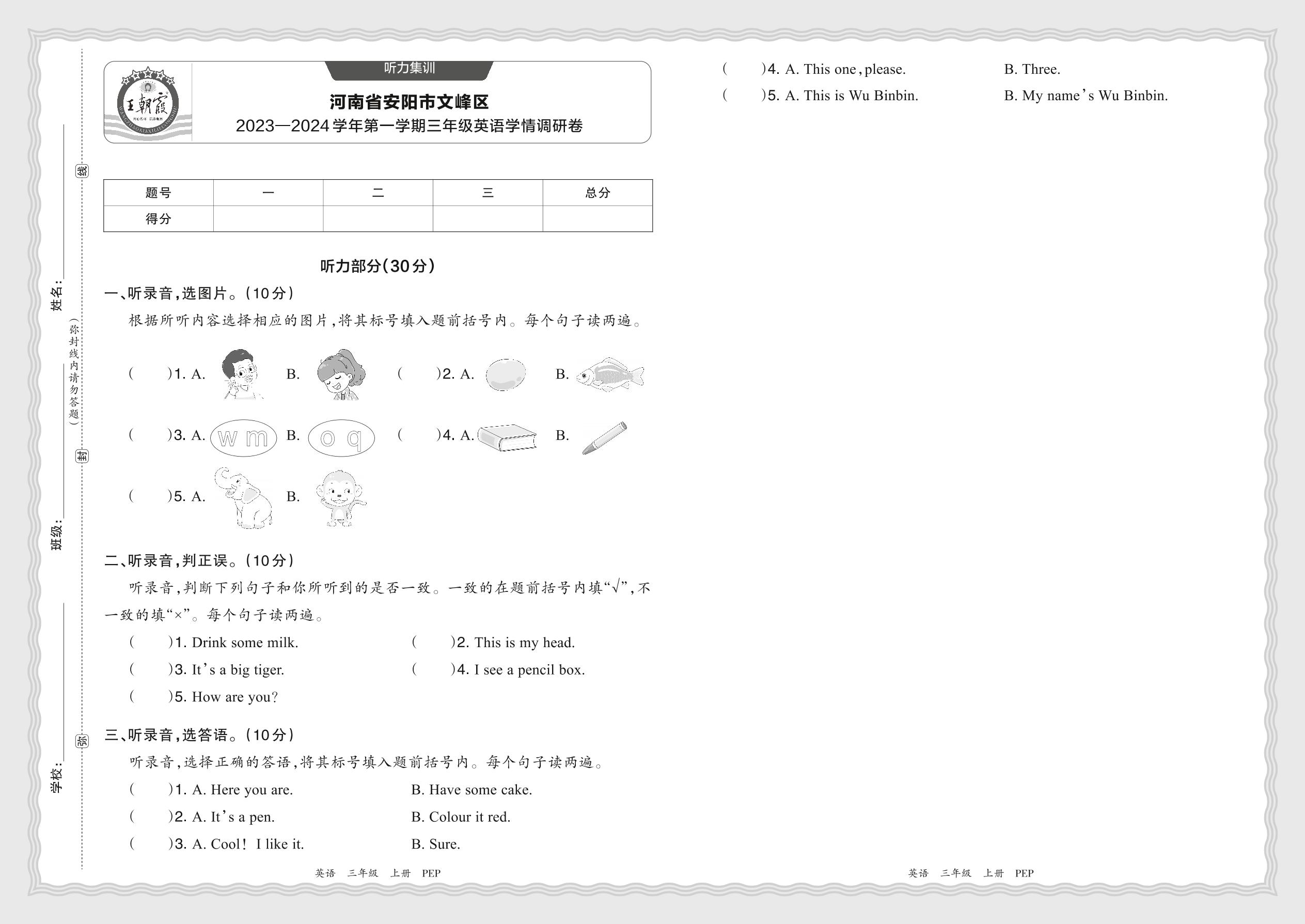 【听力集训】河南省安阳市文峰区2023—2024学年第一学期三年级英语学情调研卷(人教PEP版)