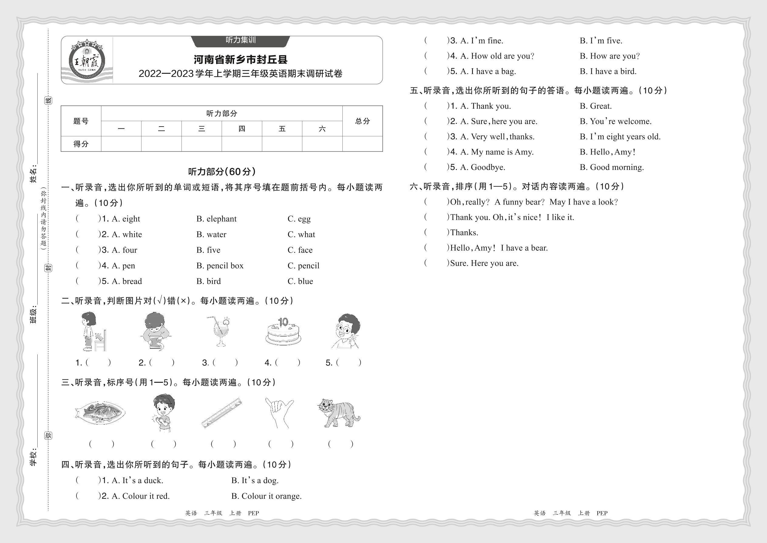 【听力集训】河南省新乡市封丘县2022—2023学年上学期三年级英语期末调研试卷(人教PEP版)
