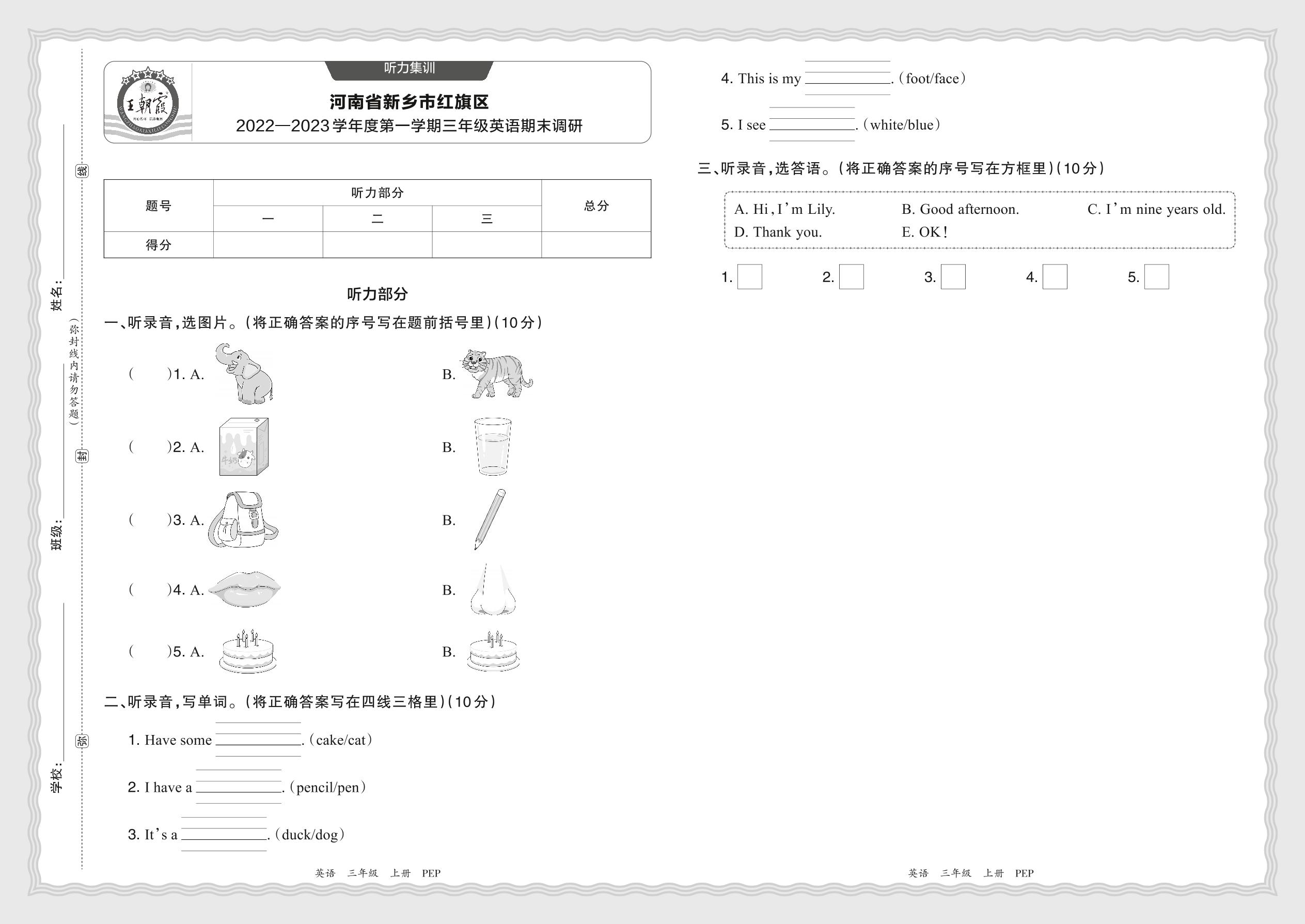 【听力集训】河南省新乡市红旗区2022—2023学年第一学期三年级英语期末调研 (人教PEP版)