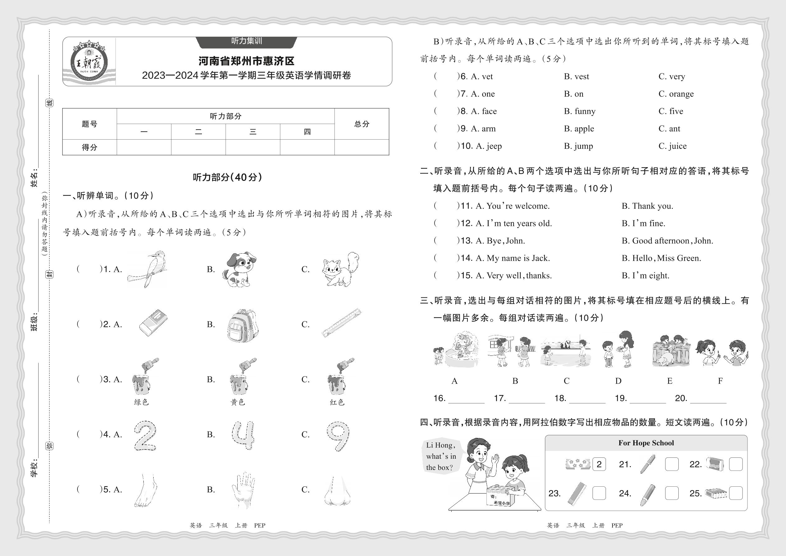 【听力集训】河南省郑州市惠济区2022—2023学年上学期三年级英语期末学业水平测试试卷(人教PEP版)