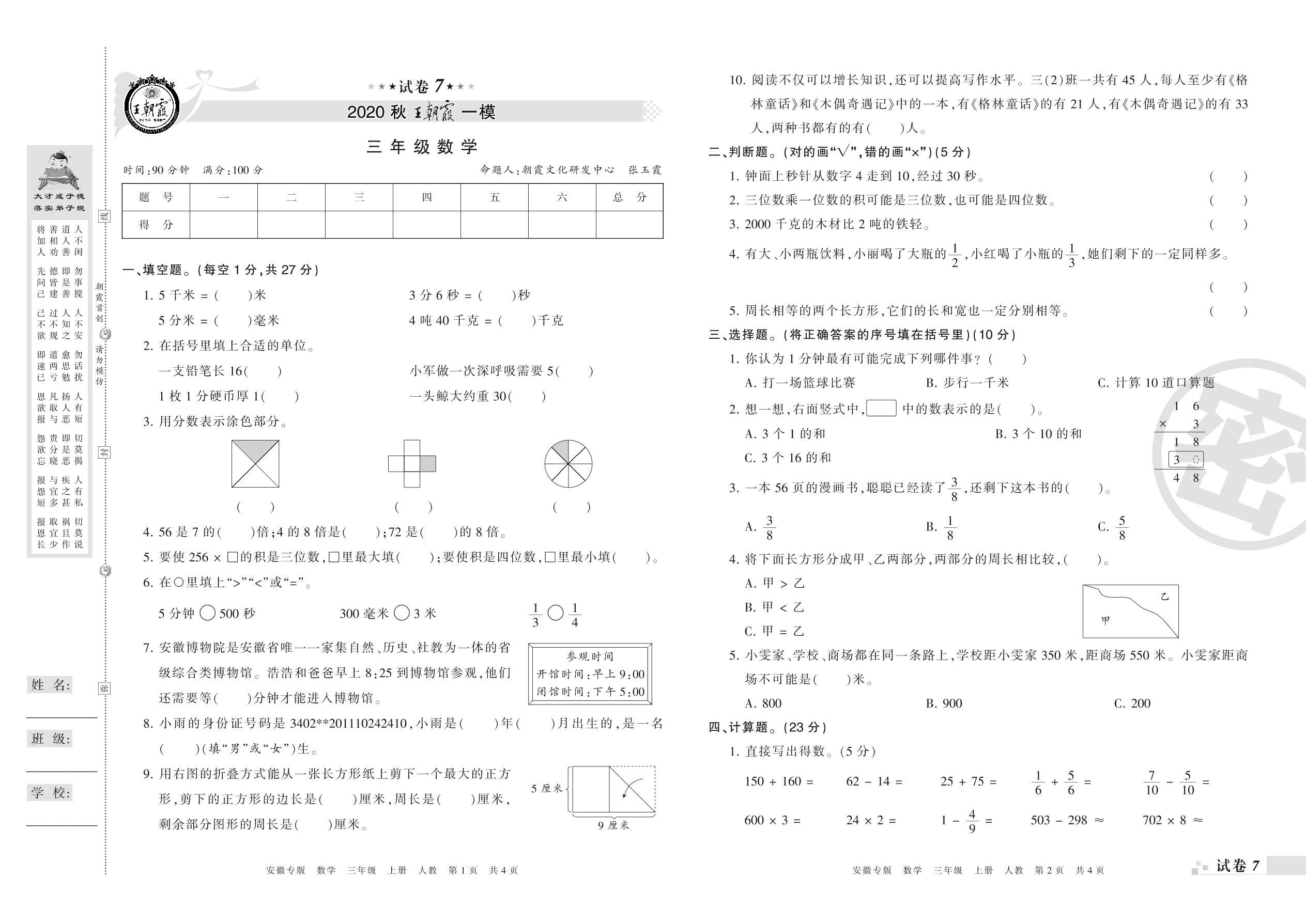 王朝霞期末模拟卷三年级上册数学(人教版)_R21080491922【7】