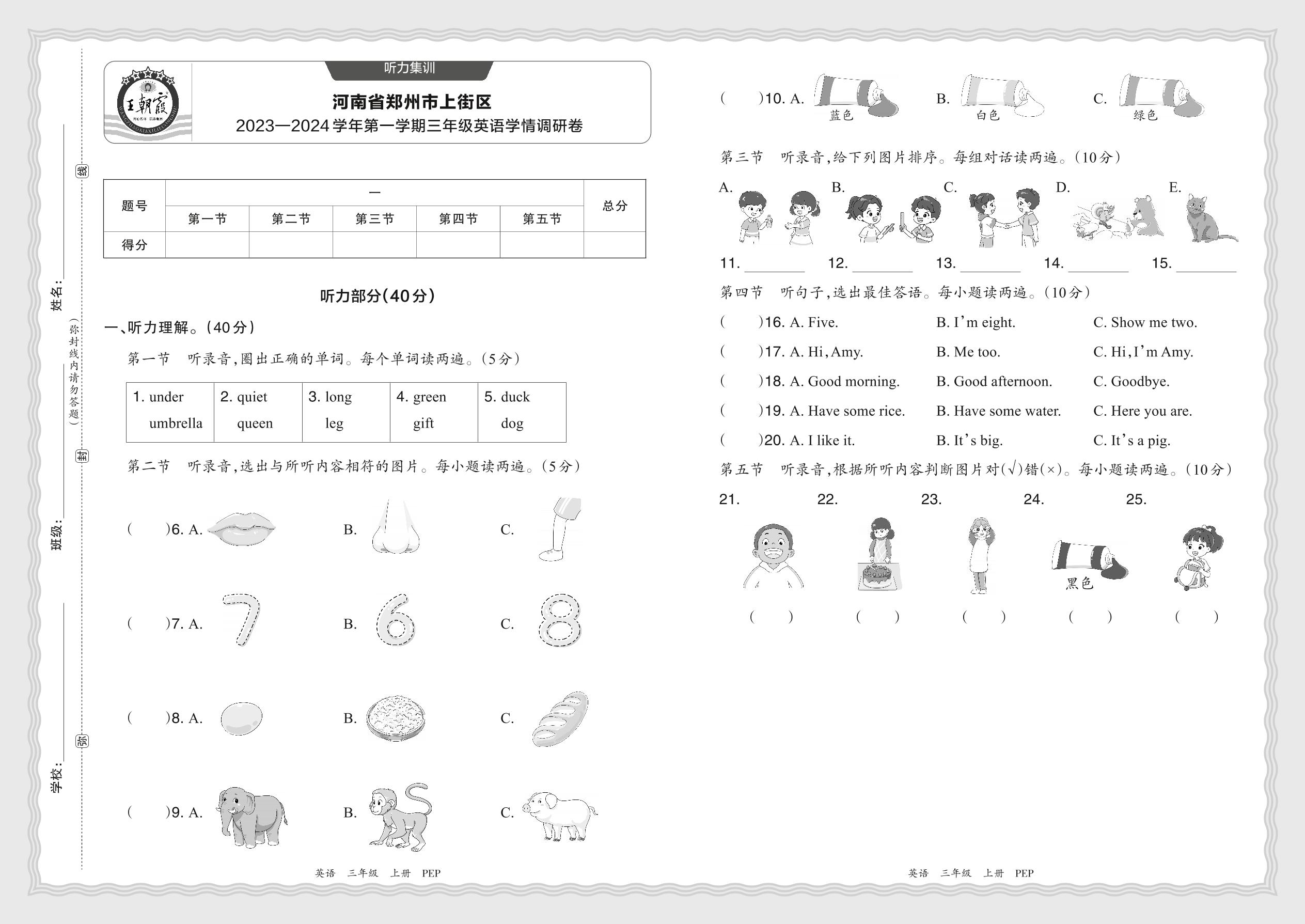 【听力集训】河南省郑州市上街区2023—2024学年第一学期三年级英语学情调研卷(人教PEP版)