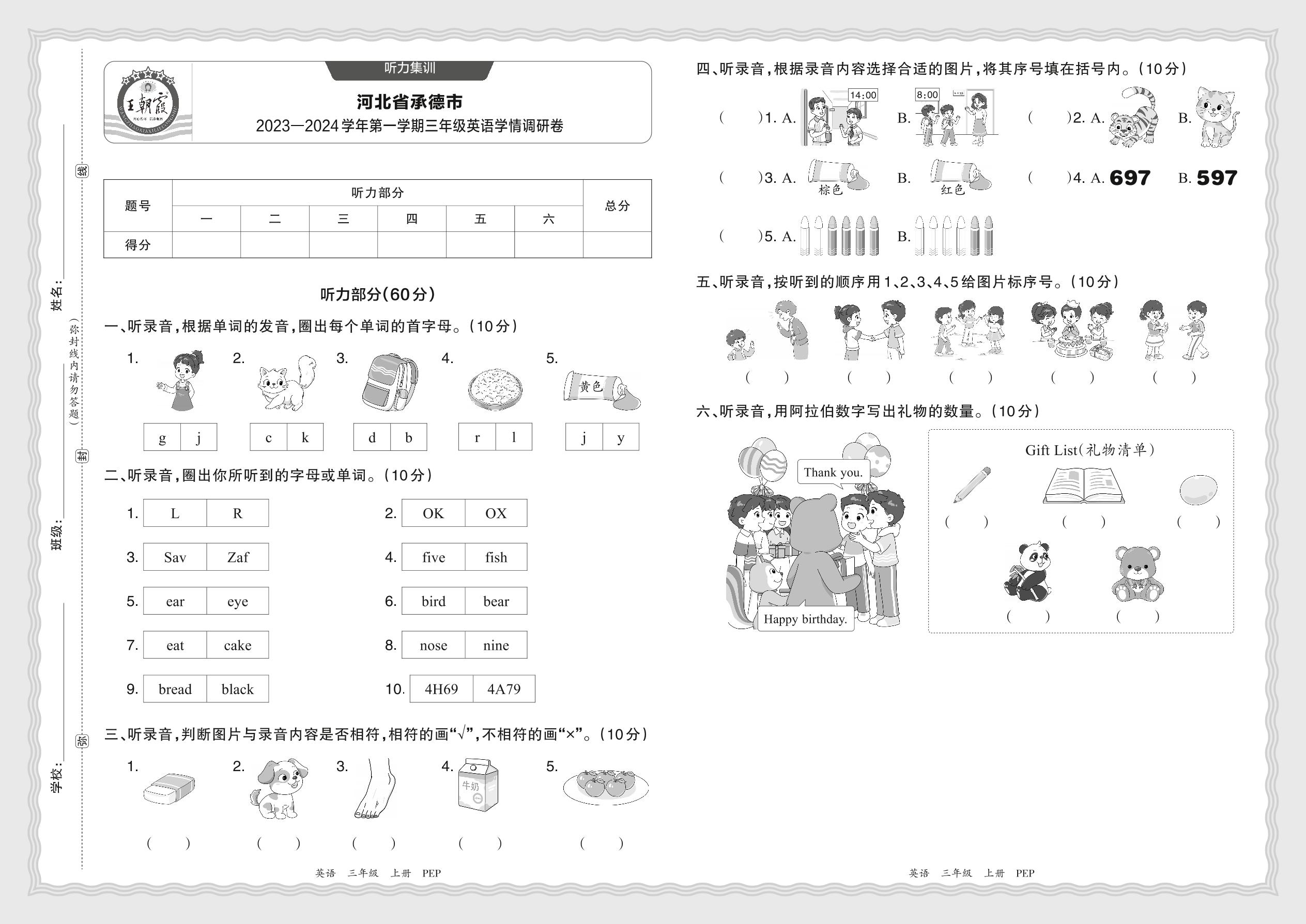 【听力集训】河北省承德市2023—2024学年第一学期三年级英语学情调研卷(人教PEP版)
